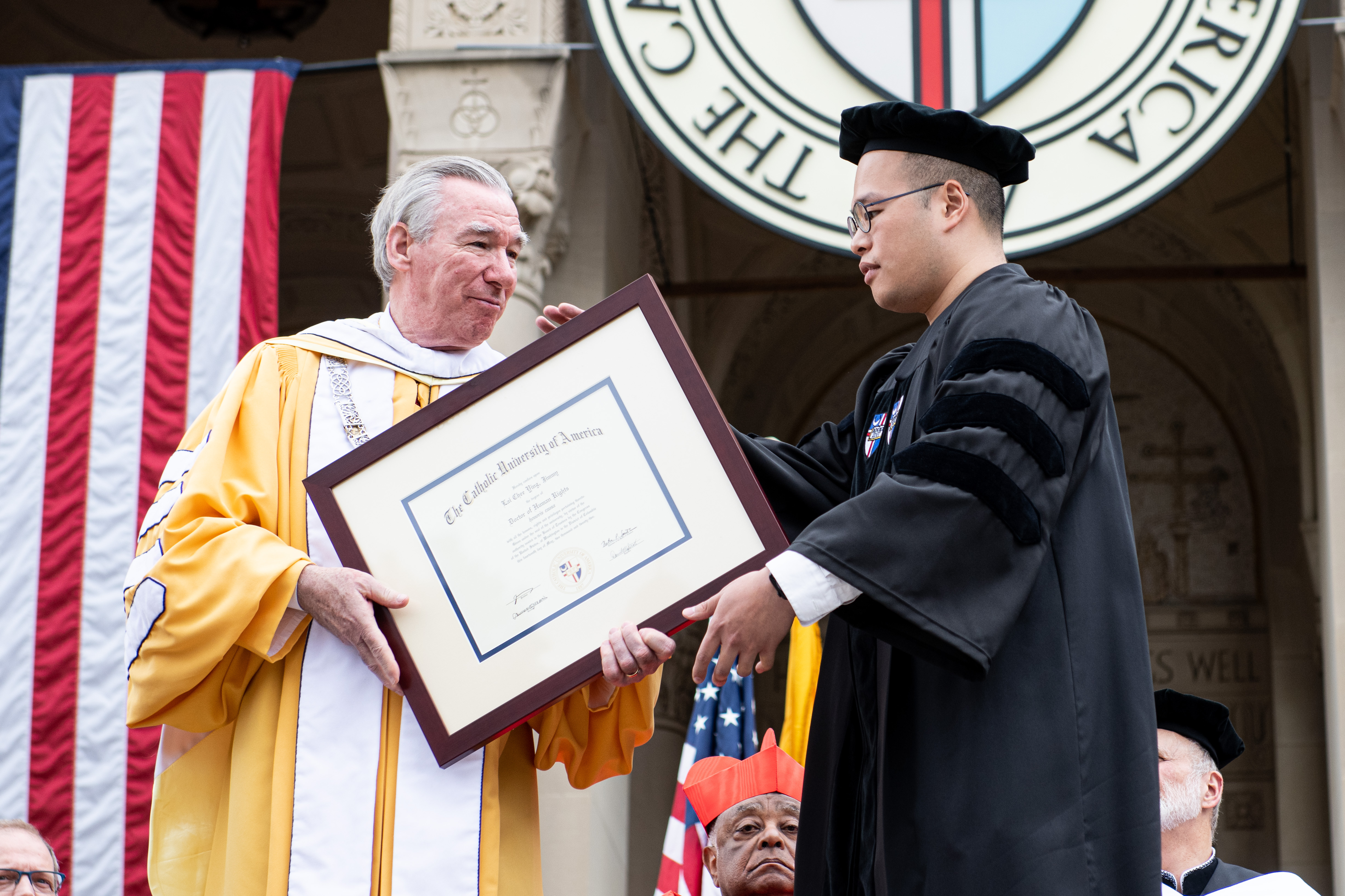A poignant moment — and sustained applause — came when Sebastien Lai received the honorary degree on behalf of his father, Jimmy Lai, a prominent human rights advocate who is imprisoned in Hong Kong. Just days before commencement, Cardinal Joseph Zen, archbishop emeritus of Hong Kong, also was arrested (then released) by the authorities. Cardinal Zen baptized Jimmy in 1997.