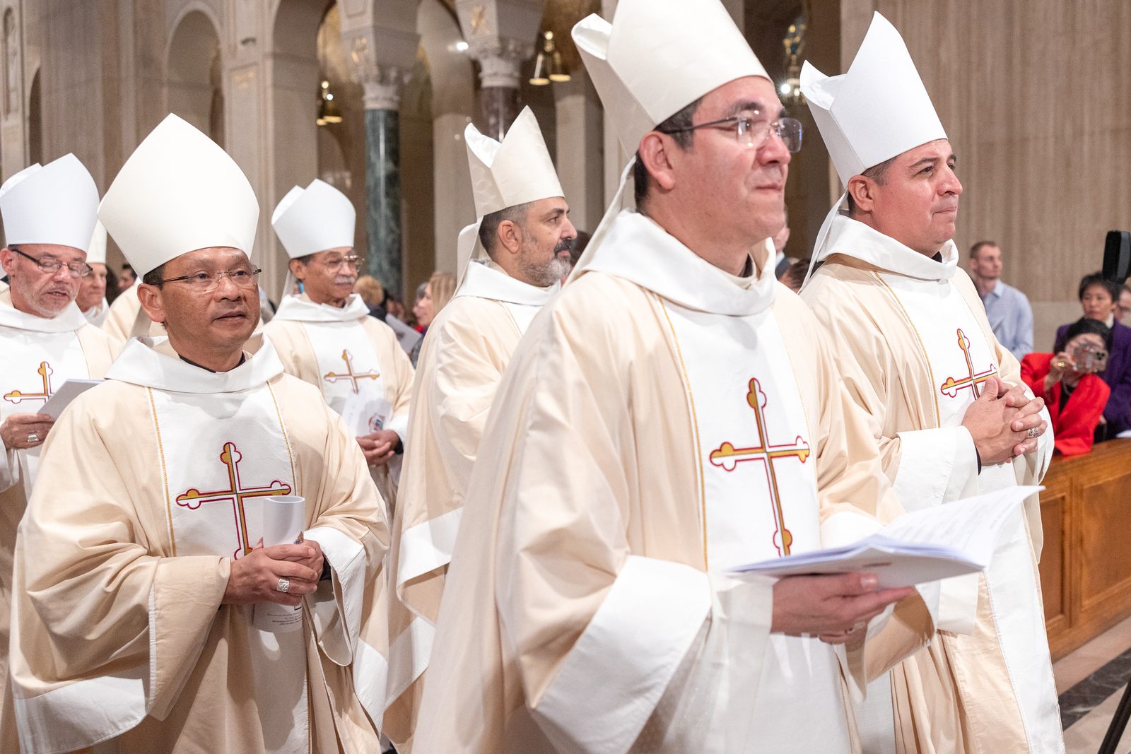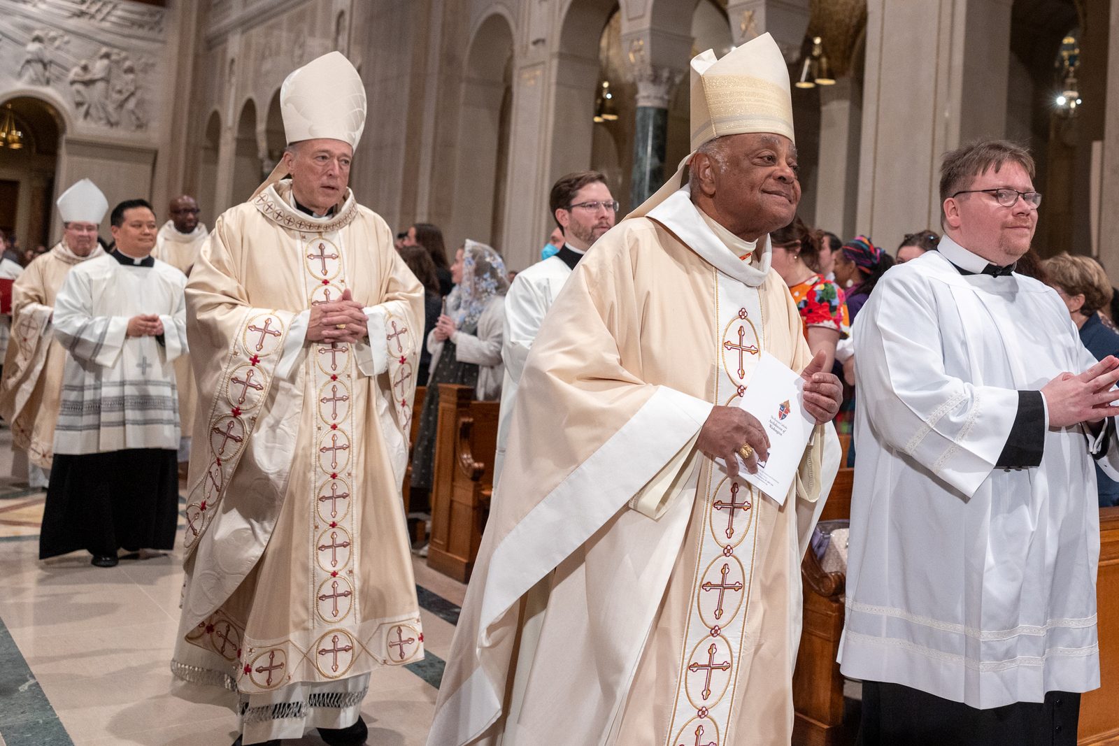 The opening procession for the Solemn Mass of Installation for Cardinal Robert McElroy as the new archbishop of Washington on March 11, 2025 at the Basilica of the National Shrine of the Immaculate Conception included eight cardinals. Seven of the participating cardinals can be seen in this photo, including from right to left, Cardinal Sean O’Malley, a Capuchin Franciscan who is the archbishop emeritus of Boston; Cardinal Joseph Tobin, a Redemptorist who is the archbishop of Newark, New Jersey; Chicago Cardinal Blase Cupich; New York Cardinal Timothy Dolan; Cardinal Donald Wuerl, an archbishop emeritus of Washington; Cardinal Wilton Gregory, an archbishop emeritus of Washington; and Cardinal McElroy. Not pictured is Cardinal Christophe Pierre, the apostolic nuncio to the United States, who at the installation read the apostolic mandate from Pope Francis appointing Cardinal McElroy as the archbishop of Washington. (Catholic Standard photo by Mihoko Owada)