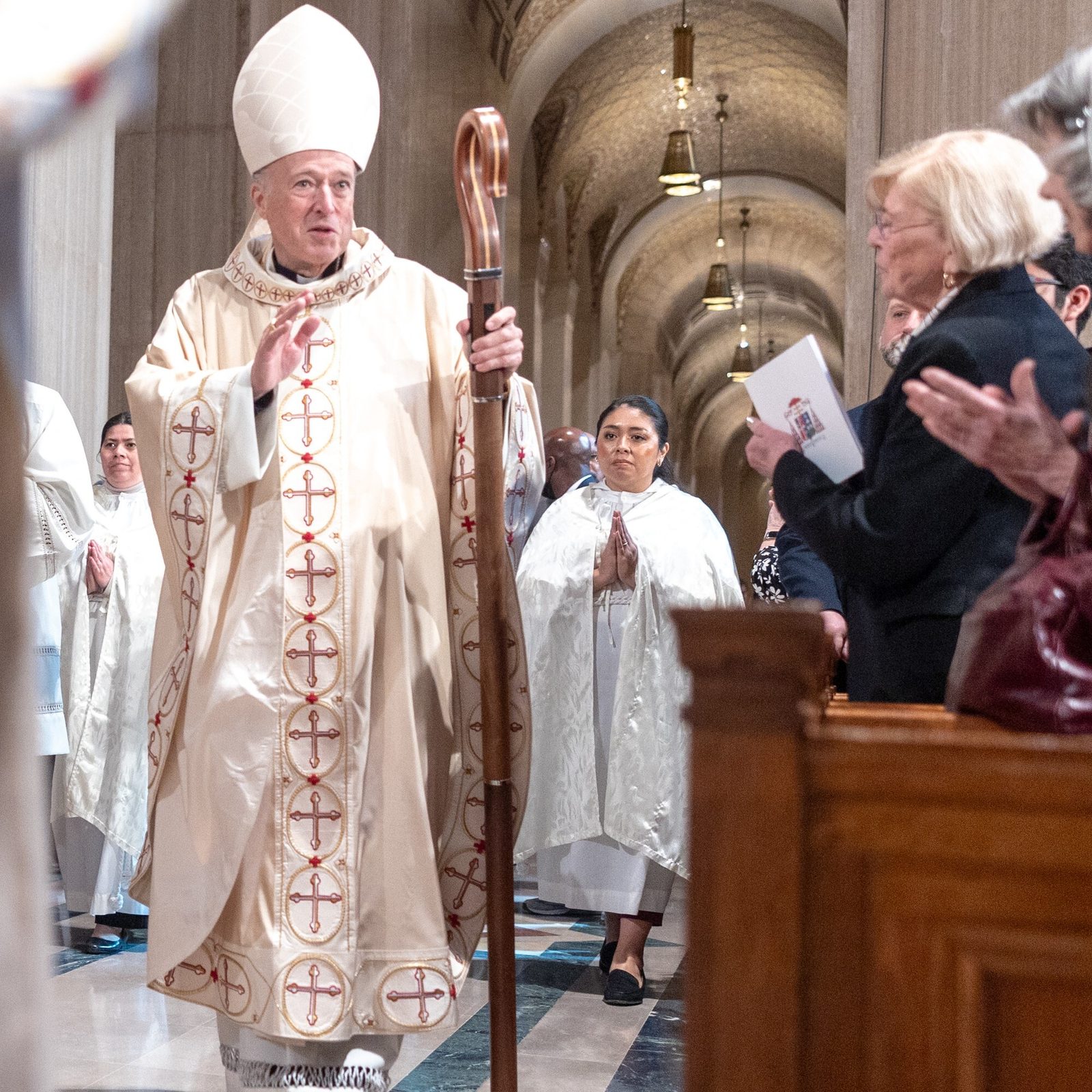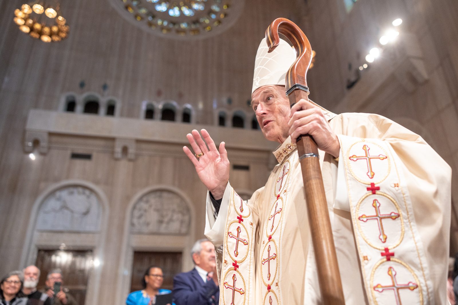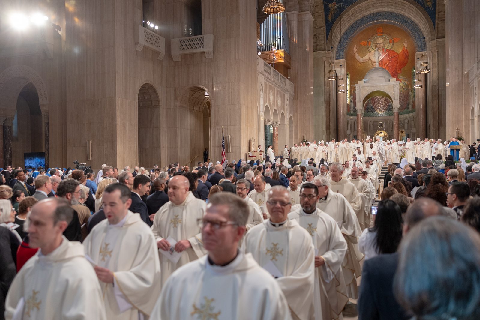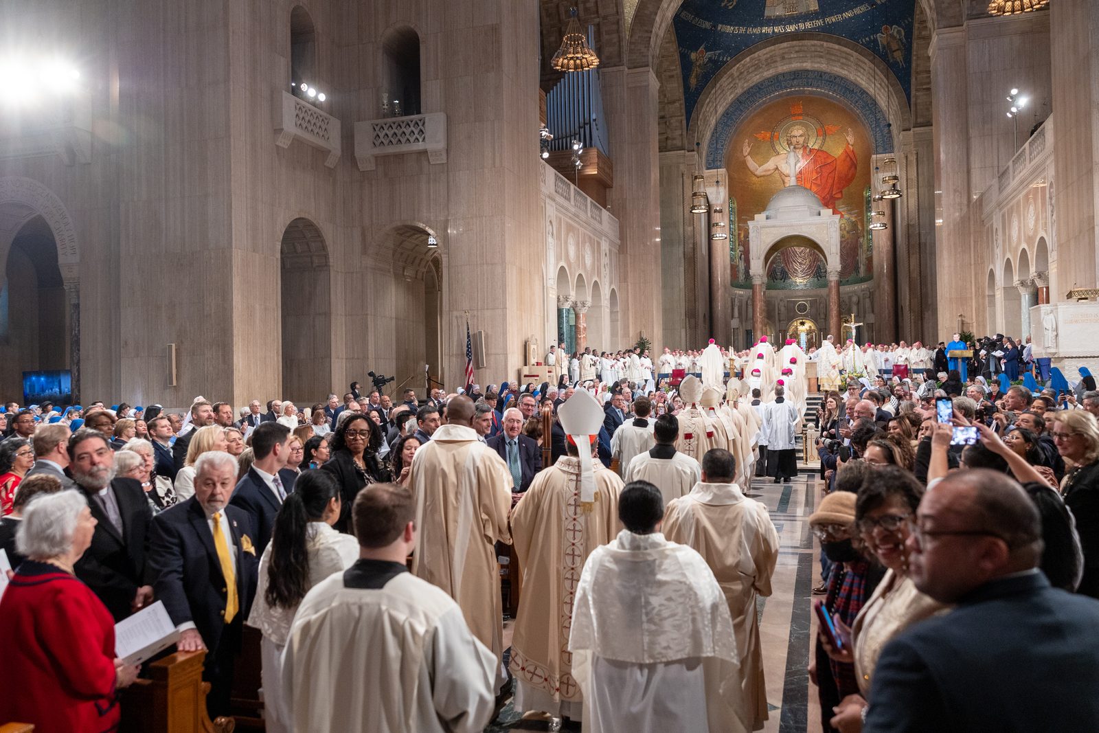 Cardinal Robert McElroy blesses the faithful at the Basilica of the National Shrine of the Immaculate Conception as he processes from the altar following his Solemn Mass of Installation on March 11, 2025 as the new archbishop of Washington. (Catholic Standard photo by Mihoko Owada)