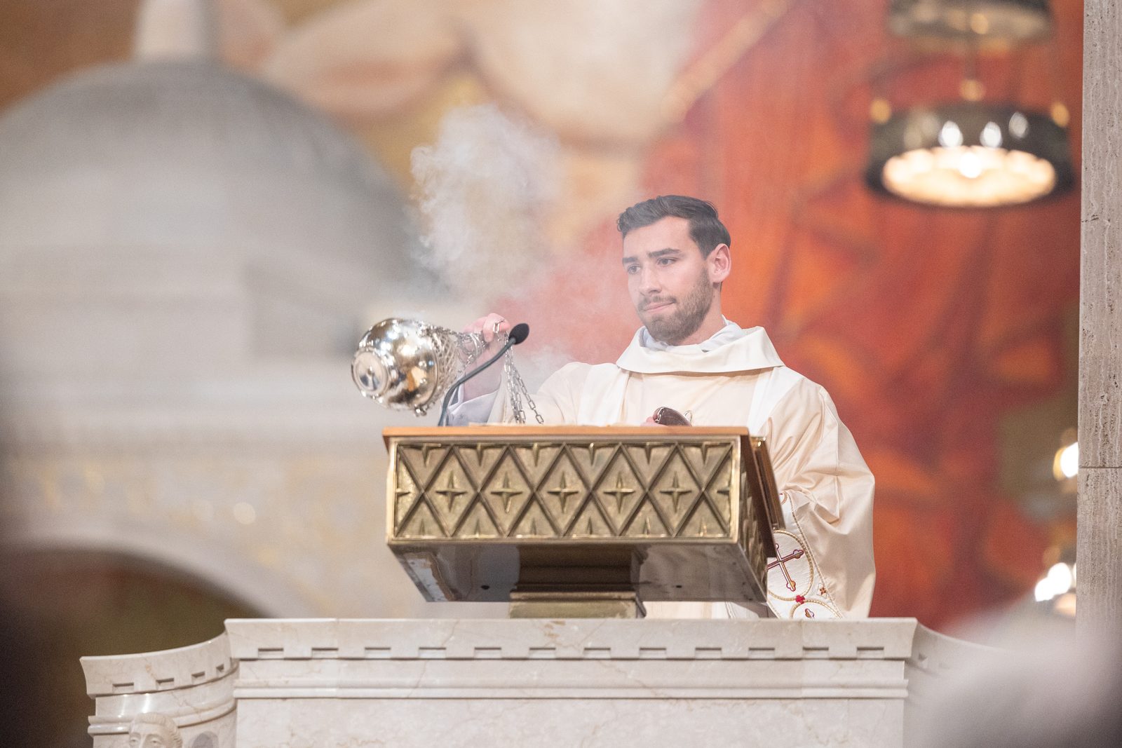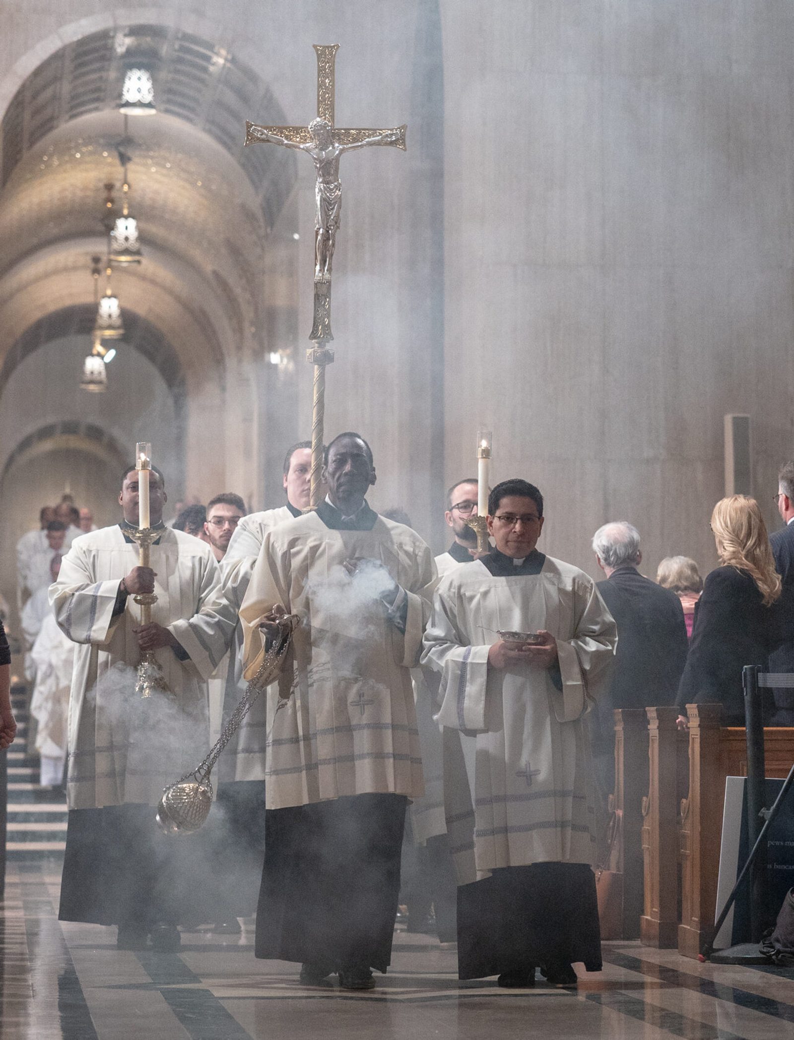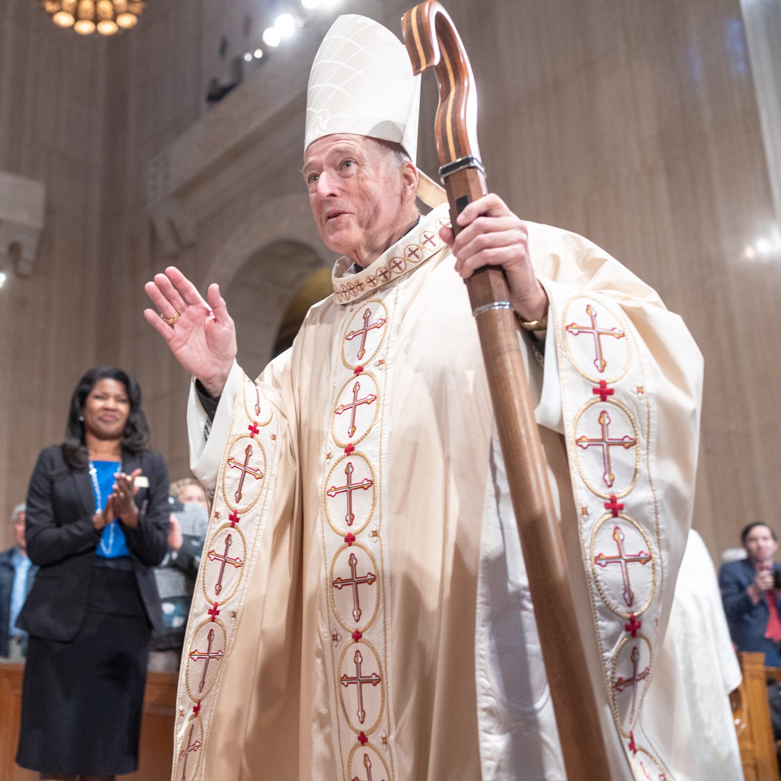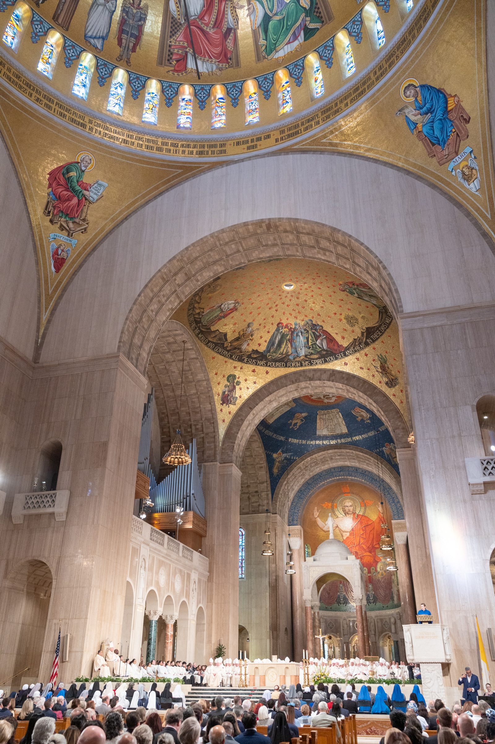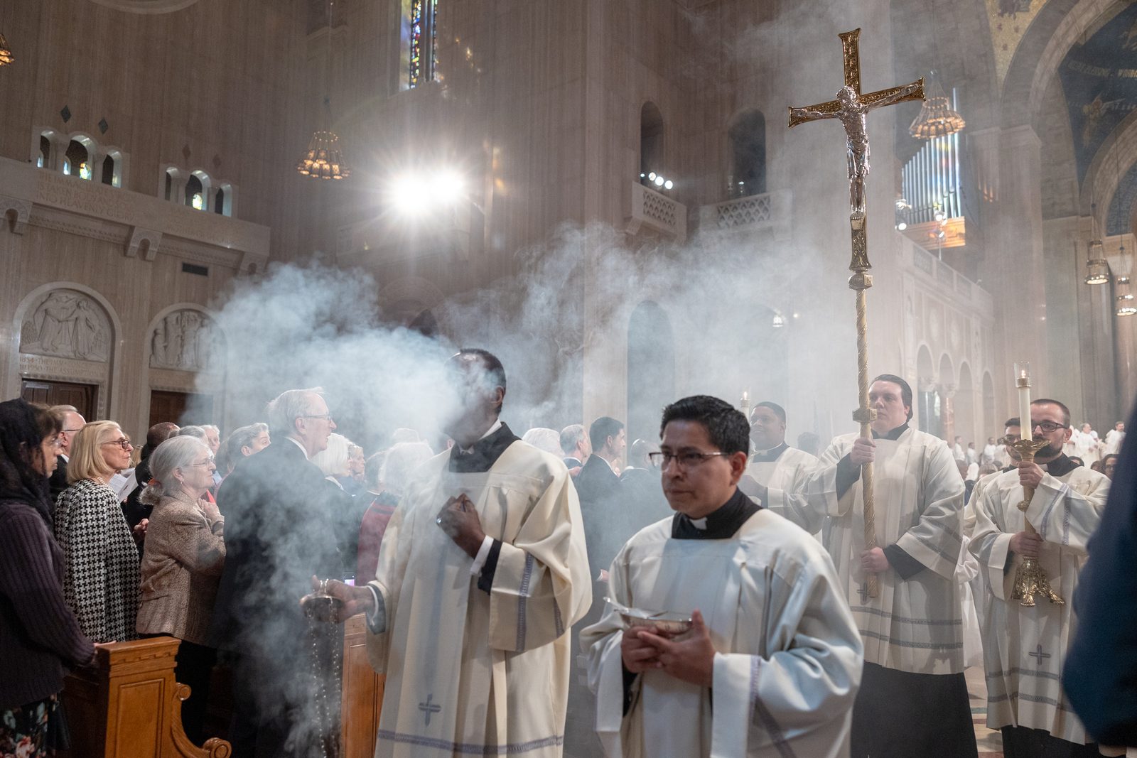Cardinal Robert McElroy blesses the faithful at the Basilica of the National Shrine of the Immaculate Conception as he processes from the altar following his Solemn Mass of Installation on March 11, 2025 as the new archbishop of Washington. (Catholic Standard photo by Mihoko Owada)