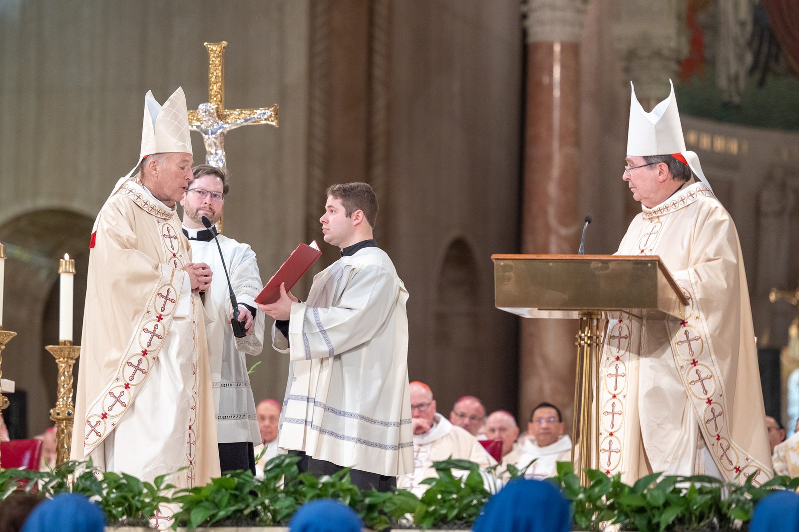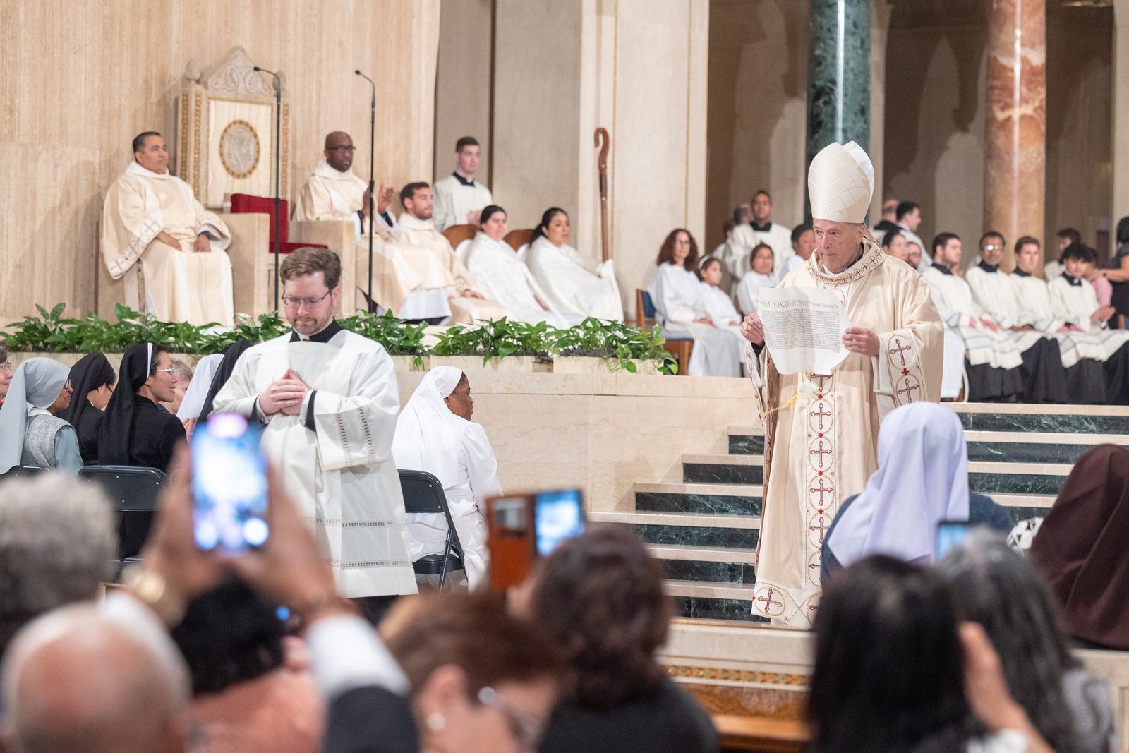 Cardinal Robert McElroy holds the apostolic mandate from Pope Francis appointing him as the new archbishop of Washington and displays it for the congregation during his Solemn Mass of Installation on March 11, 2025 at the Basilica of the National Shrine of the Immaculate Conception. (Catholic Standard photo by Mihoko Owada)