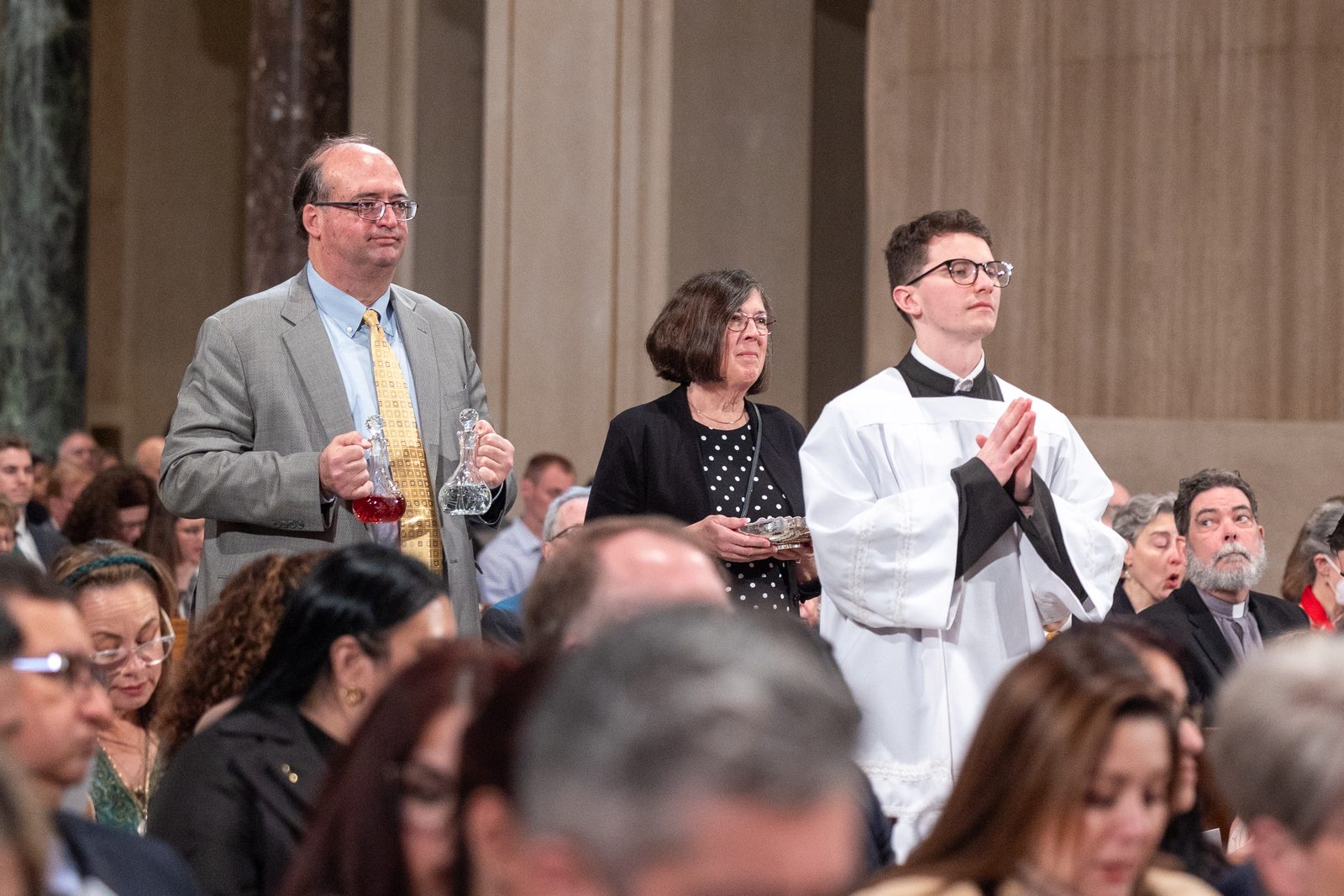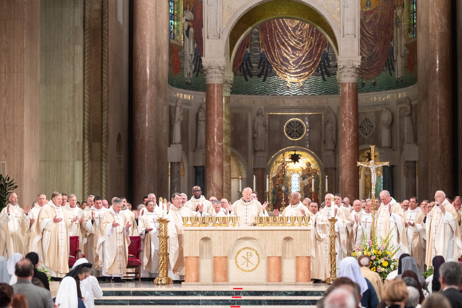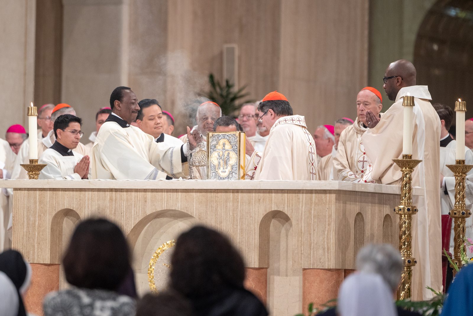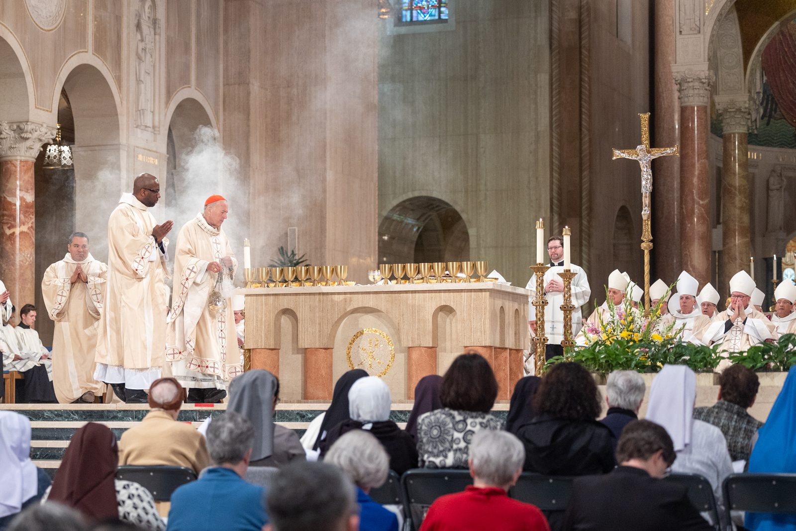 Cardinal Robert McElroy, the new archbishop of Washington, elevates the Eucharist during the consecration of his Solemn Mass of Installation, which was held on March 11, 2025 at the Basilica of the National Shrine of the Immaculate Conception. The concelebrants at the Mass included, at left, Cardinal Christophe Pierre, the apostolic nuncio to the United States, and at right, Cardinal Wilton Gregory, the archbishop emeritus of Washington. (Catholic Standard photo by Mihoko Owada)