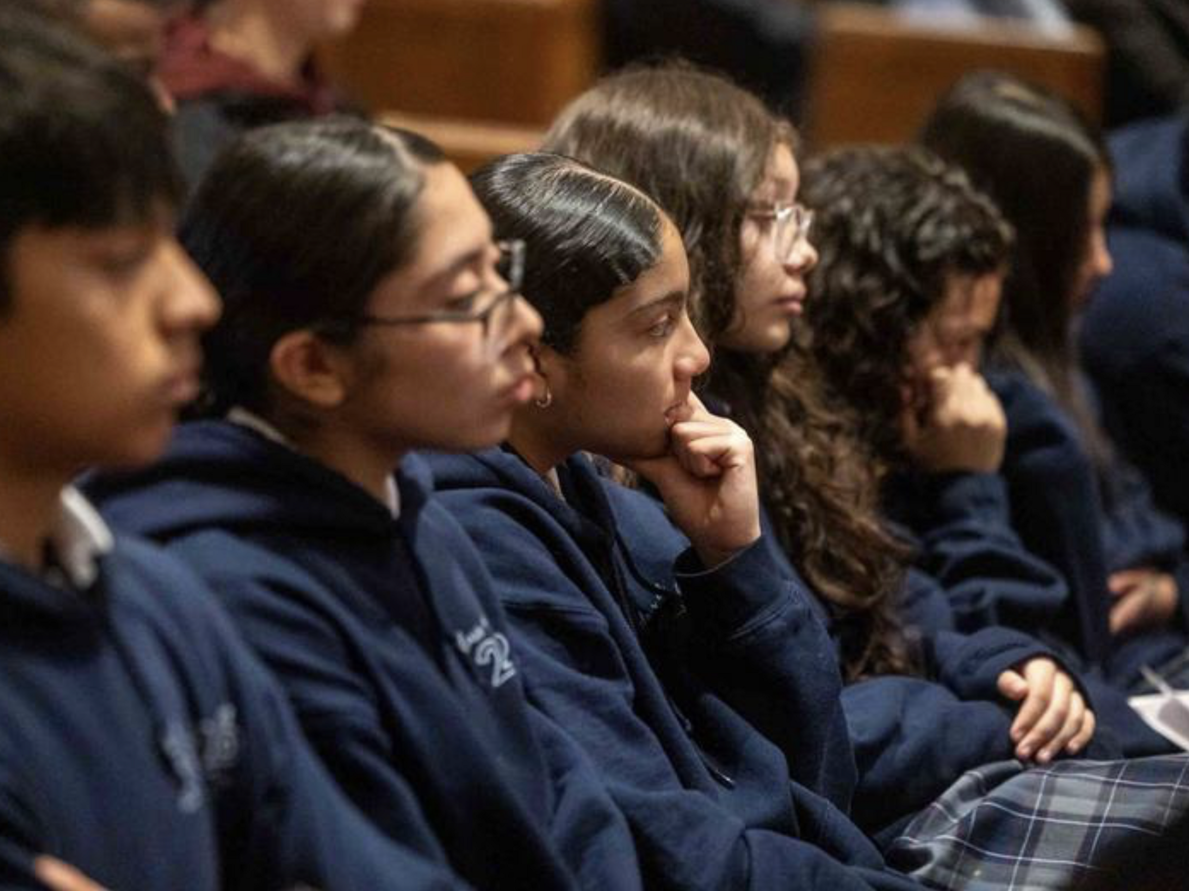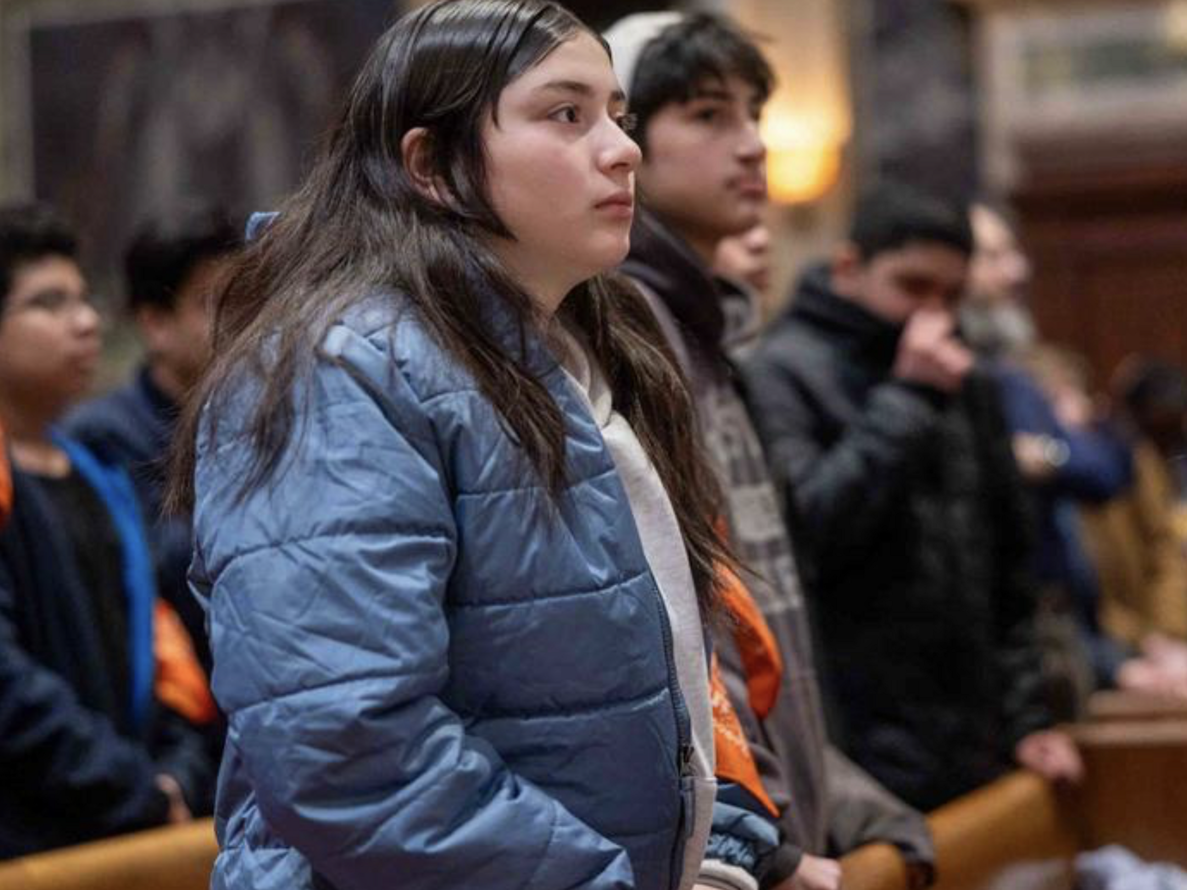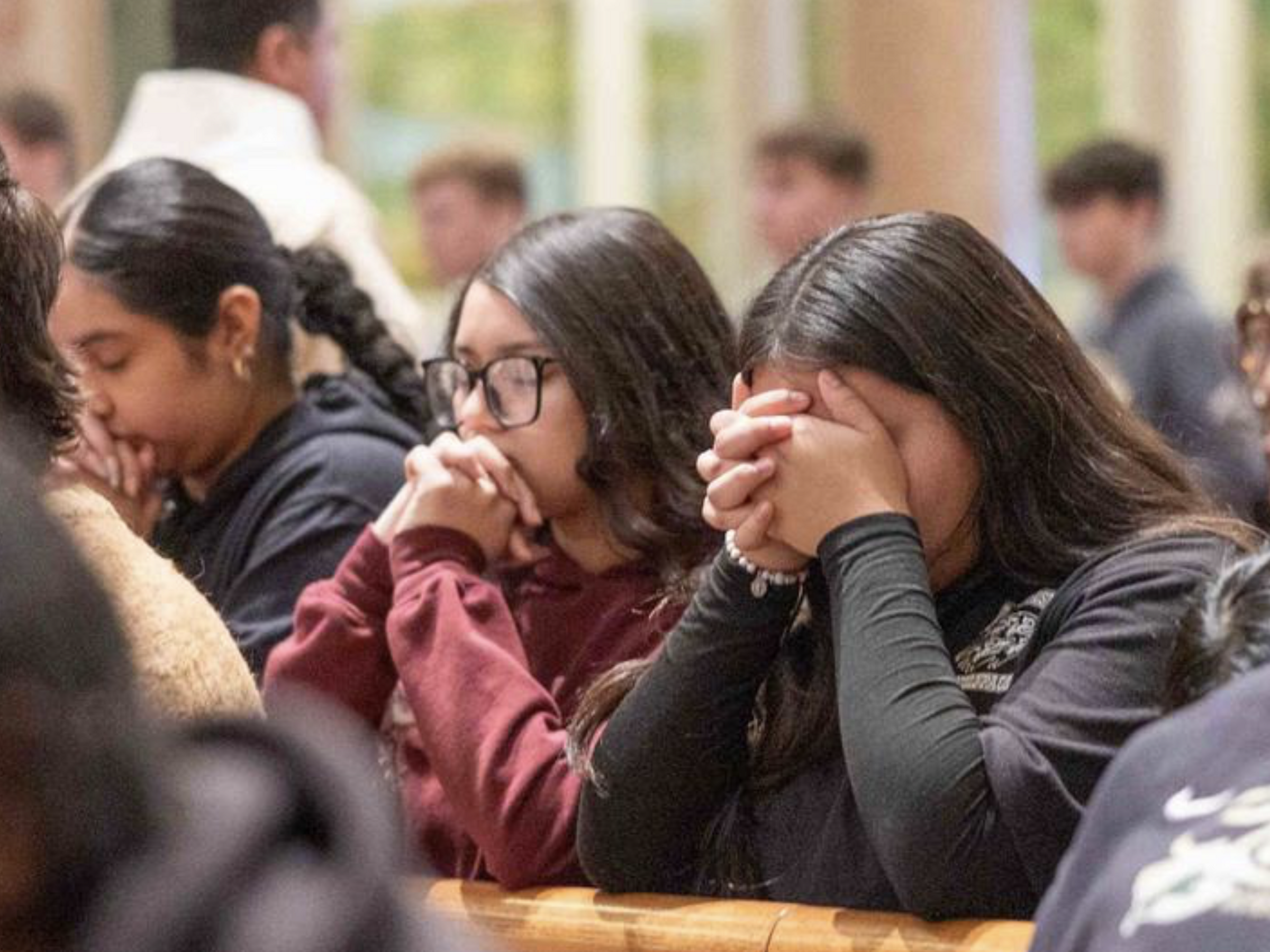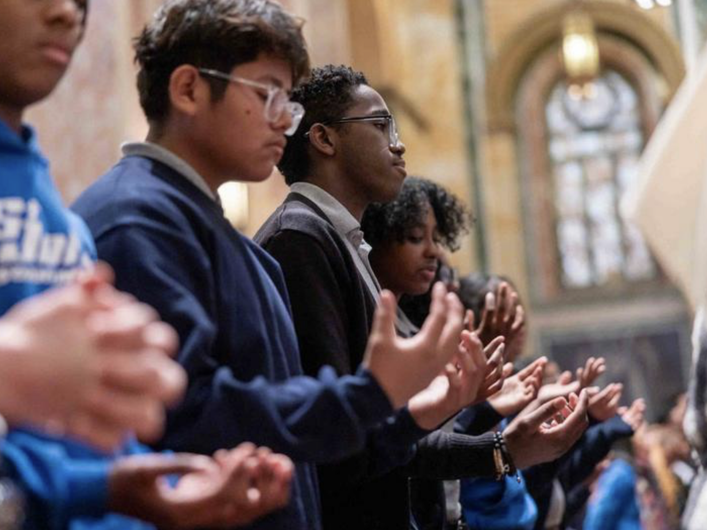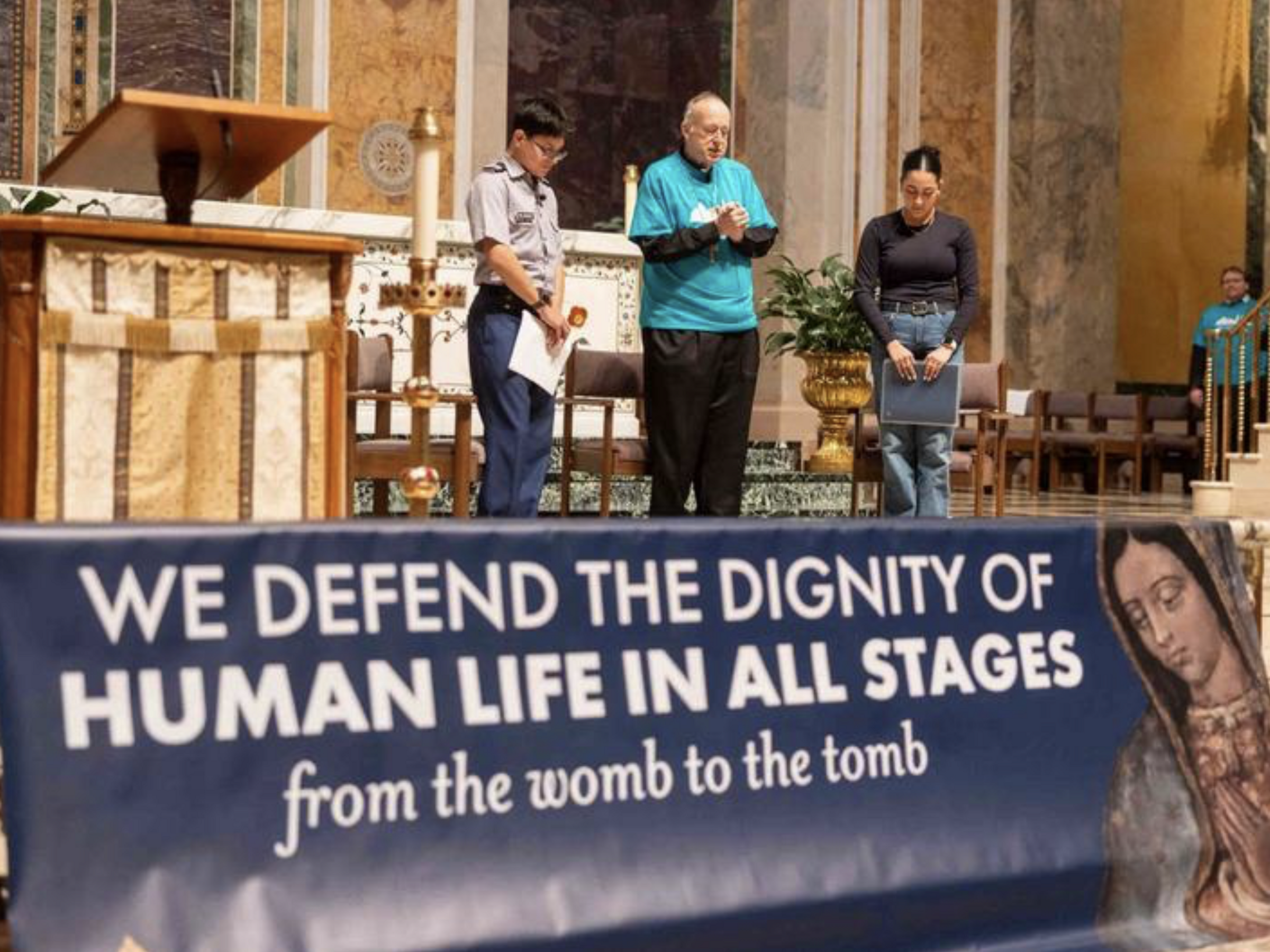 Cardinal Robert W. McElroy, the archbishop of Washington, prays with high school juniors Jorge Velasquez of St. John’s College High School in Washington, D.C., at left, and Andrea Patiño of the Academy of the Holy Cross in Kensington, Maryland, at right before a question-and-answer session that preceded the Youth Mass for Life on Jan. 23, 2026 at the Cathedral of St. Matthew the Apostle in Washington, D.C. The discussion followed testimonies from those two students who reflected on how they came to understand the dignity and value of human life. (Catholic Standard photo by Mihoko Owada)