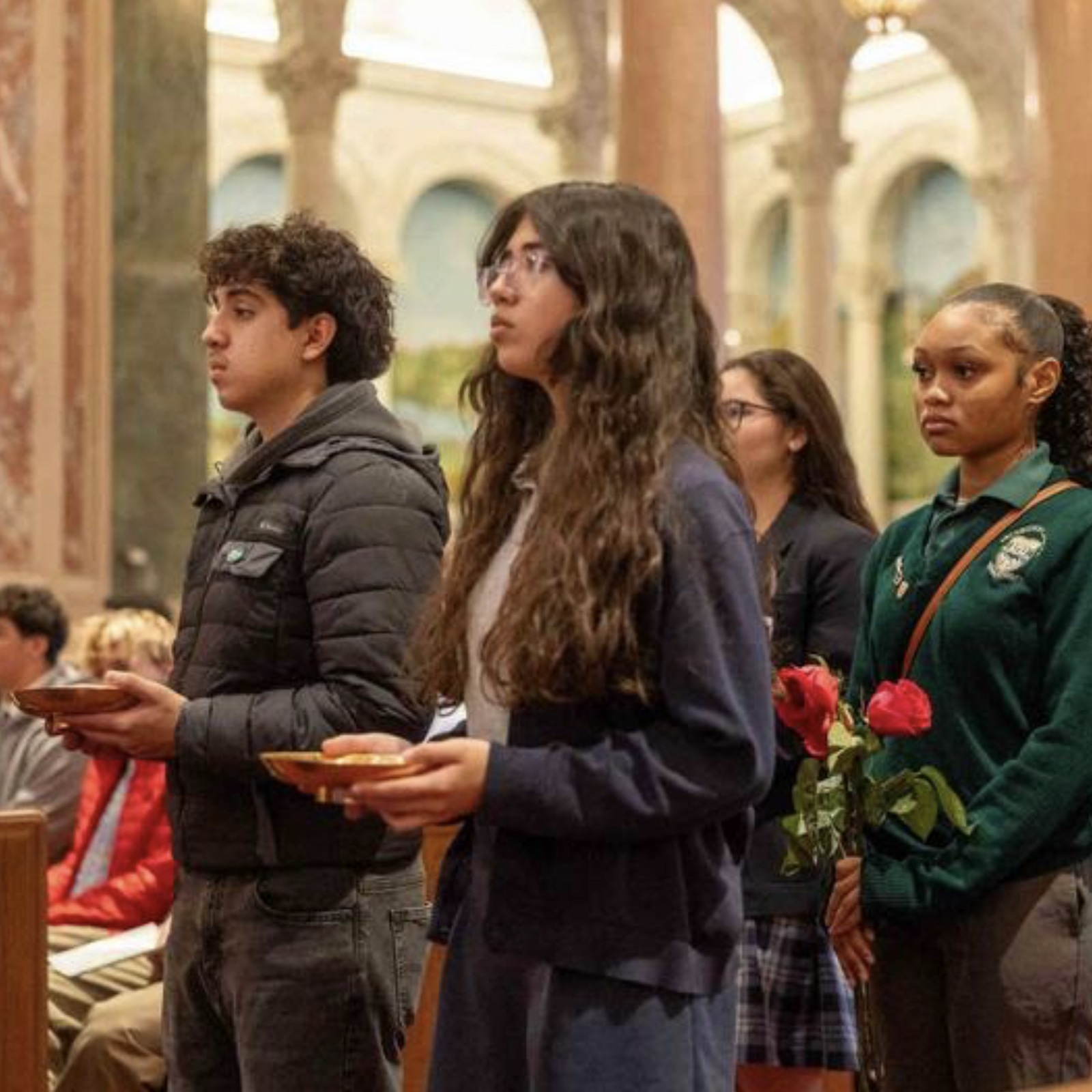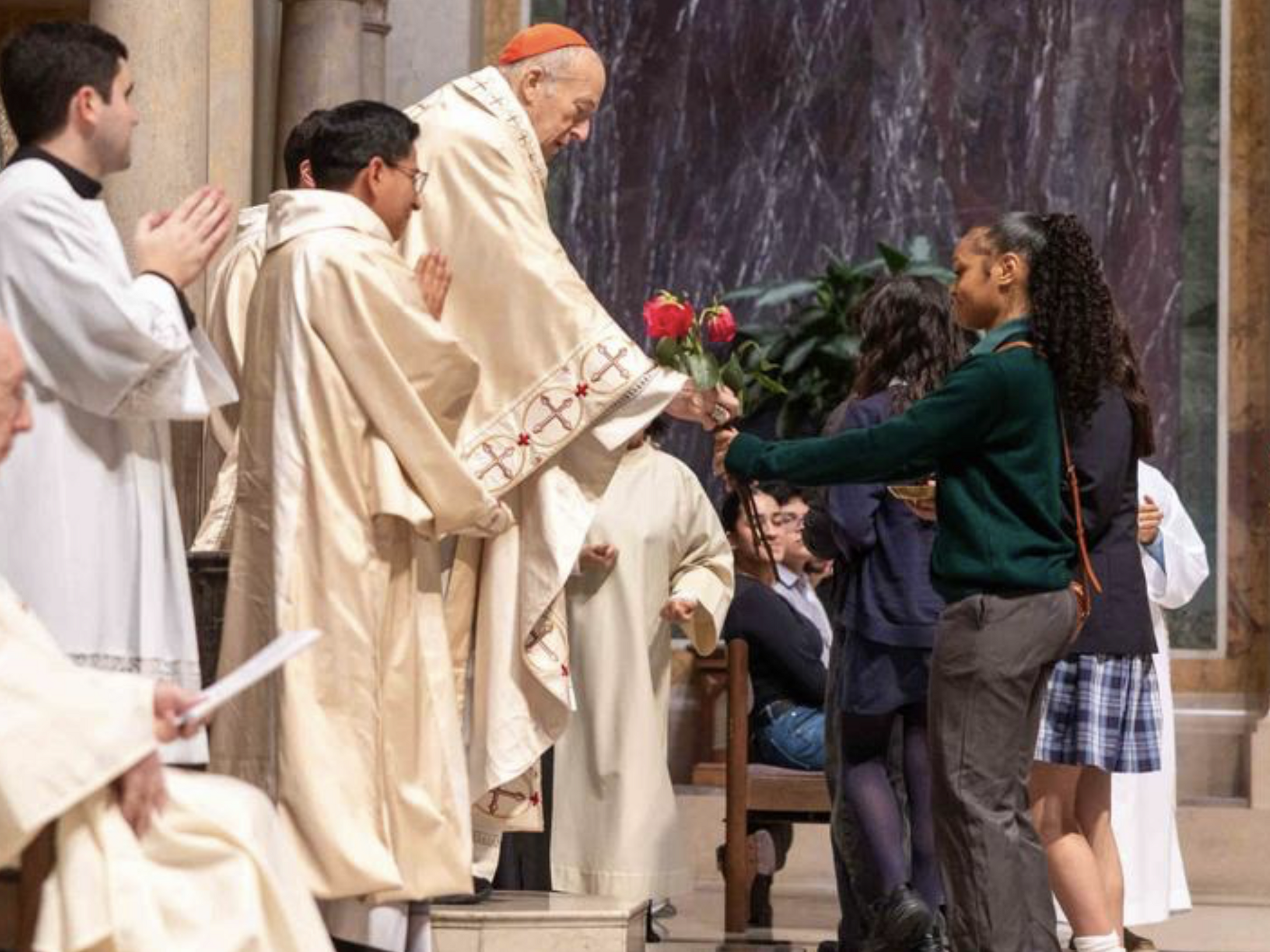 During the annual Youth Mass for Life on Jan. 23, 2026 at the Cathedral of St. Matthew the Apostle in Washington, a student presents an offertory gift of roses, a symbol of life, to Cardinal Robert W. McElroy, the main celebrant at the Mass. The Mass was held prior to the annual national March for Life. (Catholic Standard photo by Mihoko Owada)
