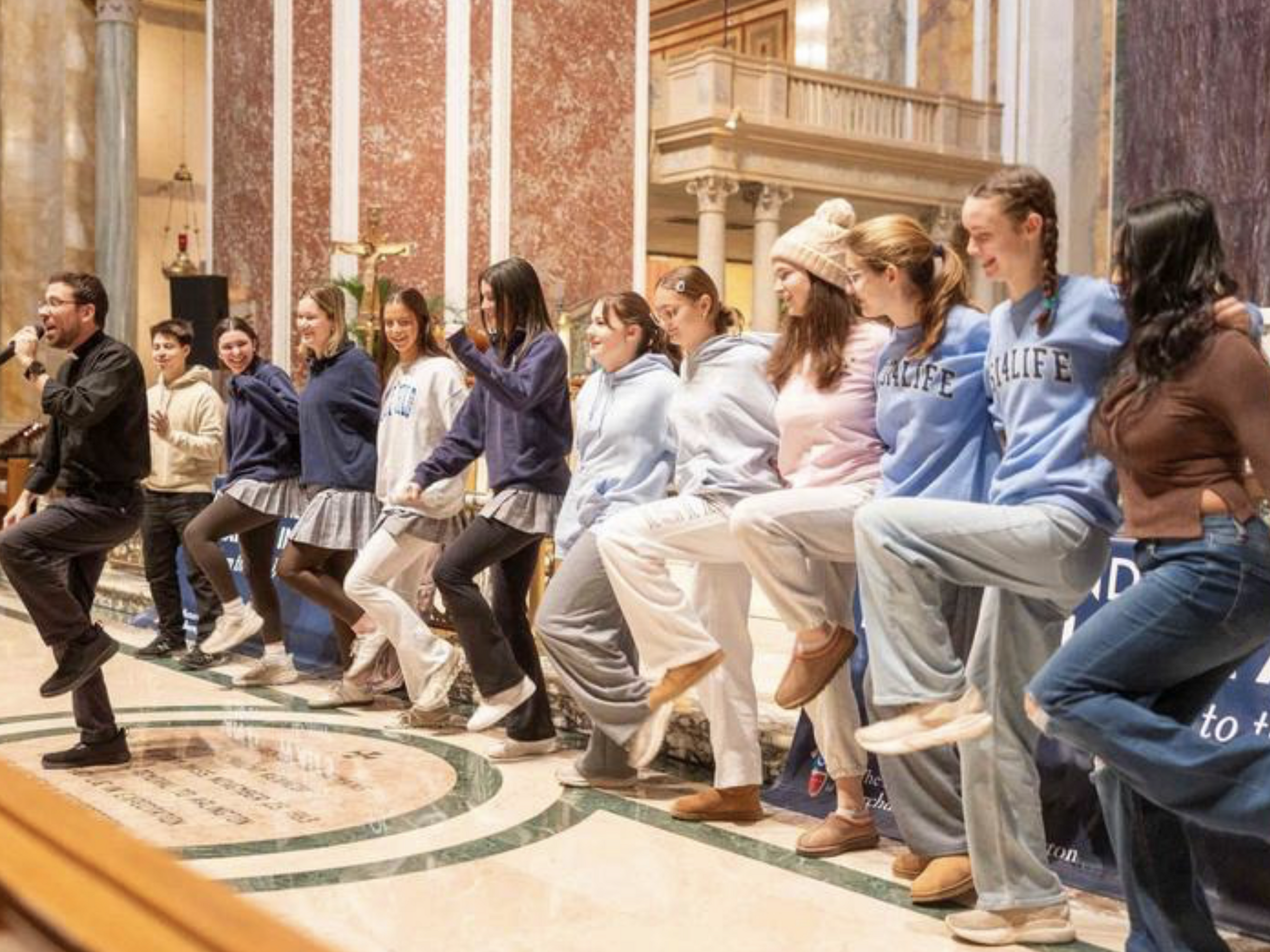 Before the Youth Mass for Life on Jan. 23 at St. Matthew's Cathedral, Father John Benson - the pastor of St. John Vianney Parish in Prince Frederick, Maryland - sang while youth formed a dance line behind him during a rally. (Catholic Standard photo by Mihoko Owada)