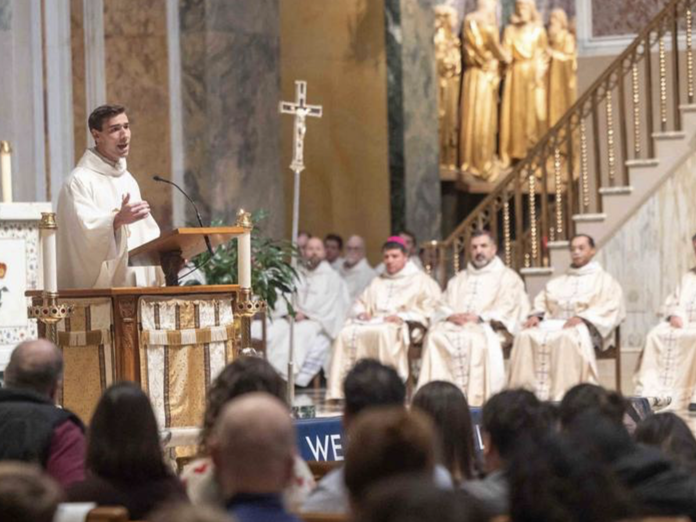 Father Danny Morrison, a parochial vicar at the Church of the Little Flower Parish in Bethesda, Maryland, delivers the homily during the Youth Mass for Life on Jan. 23 at the Cathedral of St. Matthew the Apostle in Washington. (Catholic Standard photos by Mihoko Owada)