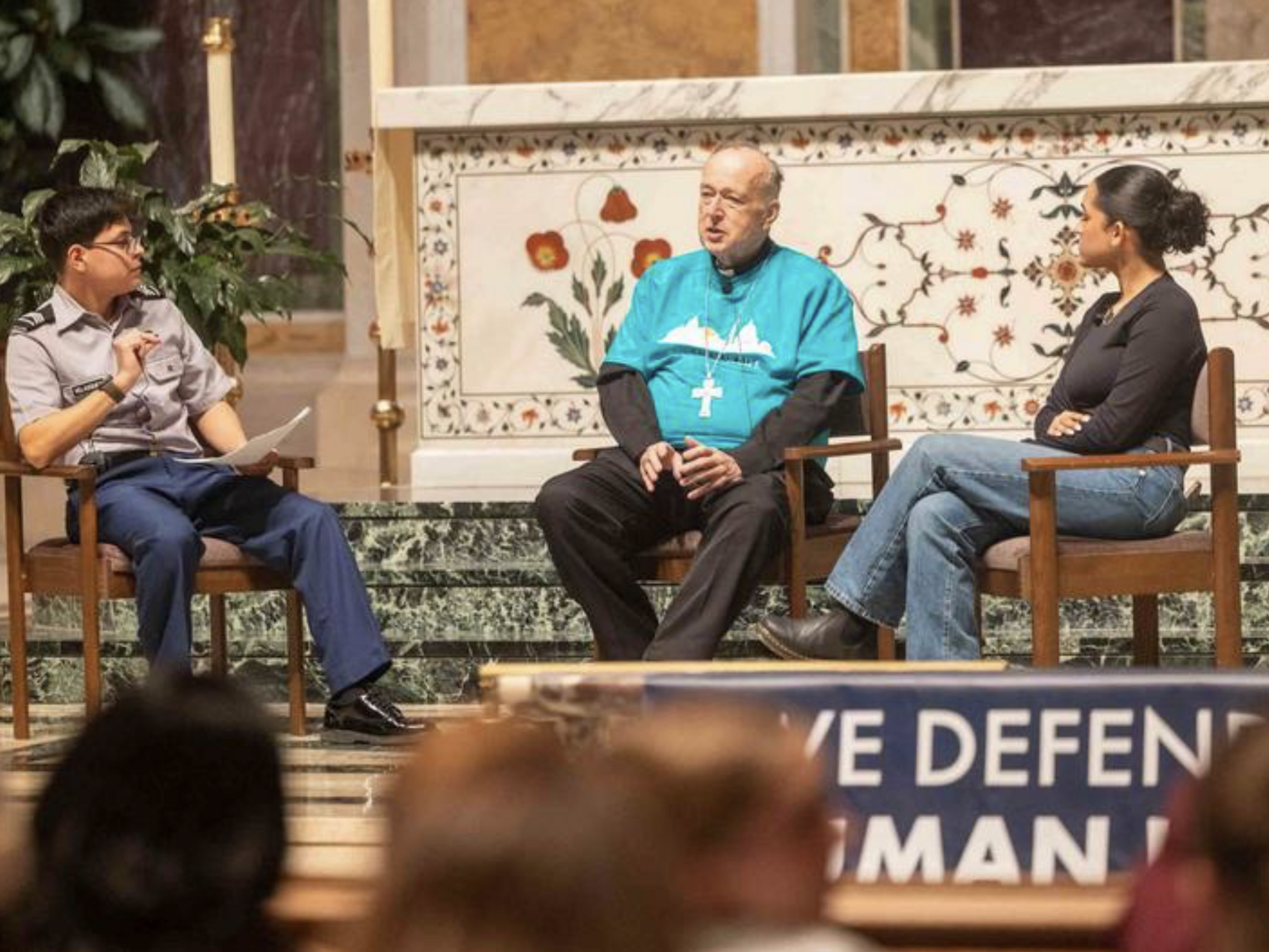 Cardinal Robert W. McElroy, the archbishop of Washington, speaks during a question-and-answer session with high school juniors Jorge Velasquez of St. John’s College High School in Washington, D.C., at left, and Andrea Patiño of the Academy of the Holy Cross in Kensington, Maryland, at right, ahead of the Youth Mass for Life on Jan. 23, 2026 at the Cathedral of St. Matthew the Apostle in Washington, D.C. The discussion followed testimonies from the two students on the dignity and value of human life. (Catholic Standard photo by Mihoko Owada)