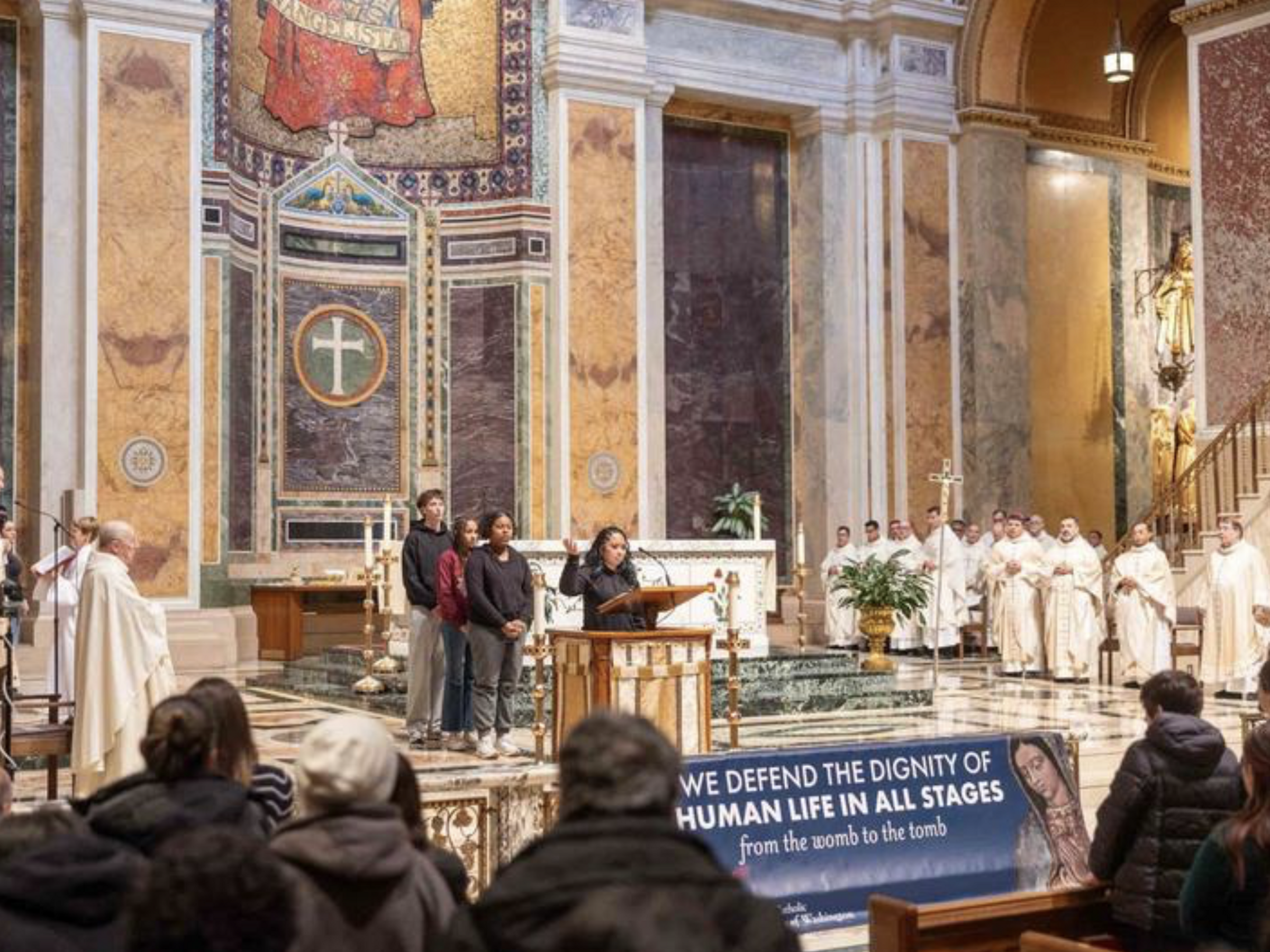 Andrea Patiño, a junior at the Academy of the Holy Cross in Kensington, Maryland, reads the first reading from the Book of Jeremiah during the Youth Mass for Life on Jan. 23, 2026 at the Cathedral of St. Matthew the Apostle in Washington, D.C. At left is Msgr. W. Ronald Jameson, the cathedral’s rector. Before the Mass, she offered a testimony on how she came to understand the dignity and value of human life. (Catholic Standard photo by Mihoko Owada)