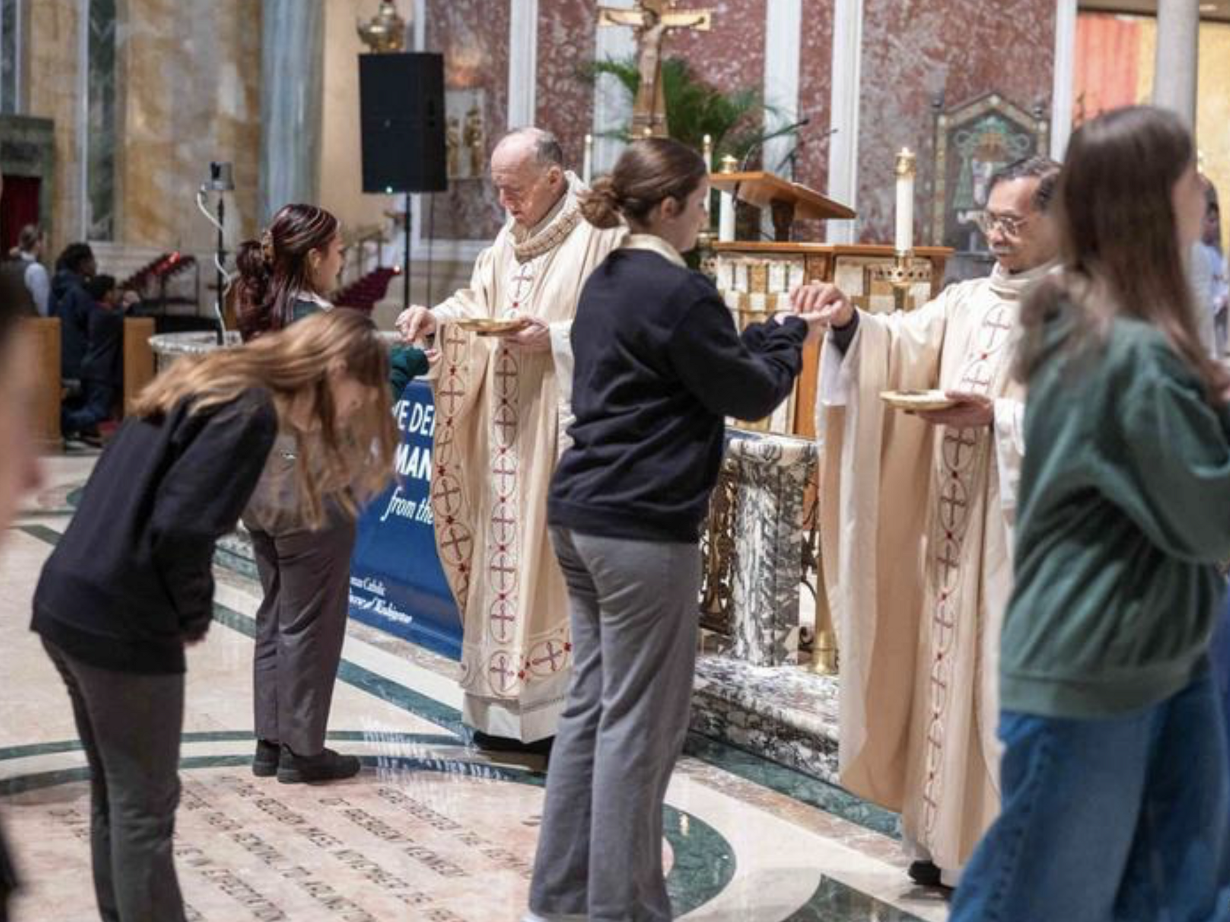 Washington Cardinal Robert W. McElroy and Auxiliary Bishop Roy Campbell Jr. give Communion to young people during the Youth Mass for Life on Jan. 23, 2026 at St. Matthew's Cathedral. (Catholic Standard photo by Mihoko Owada)