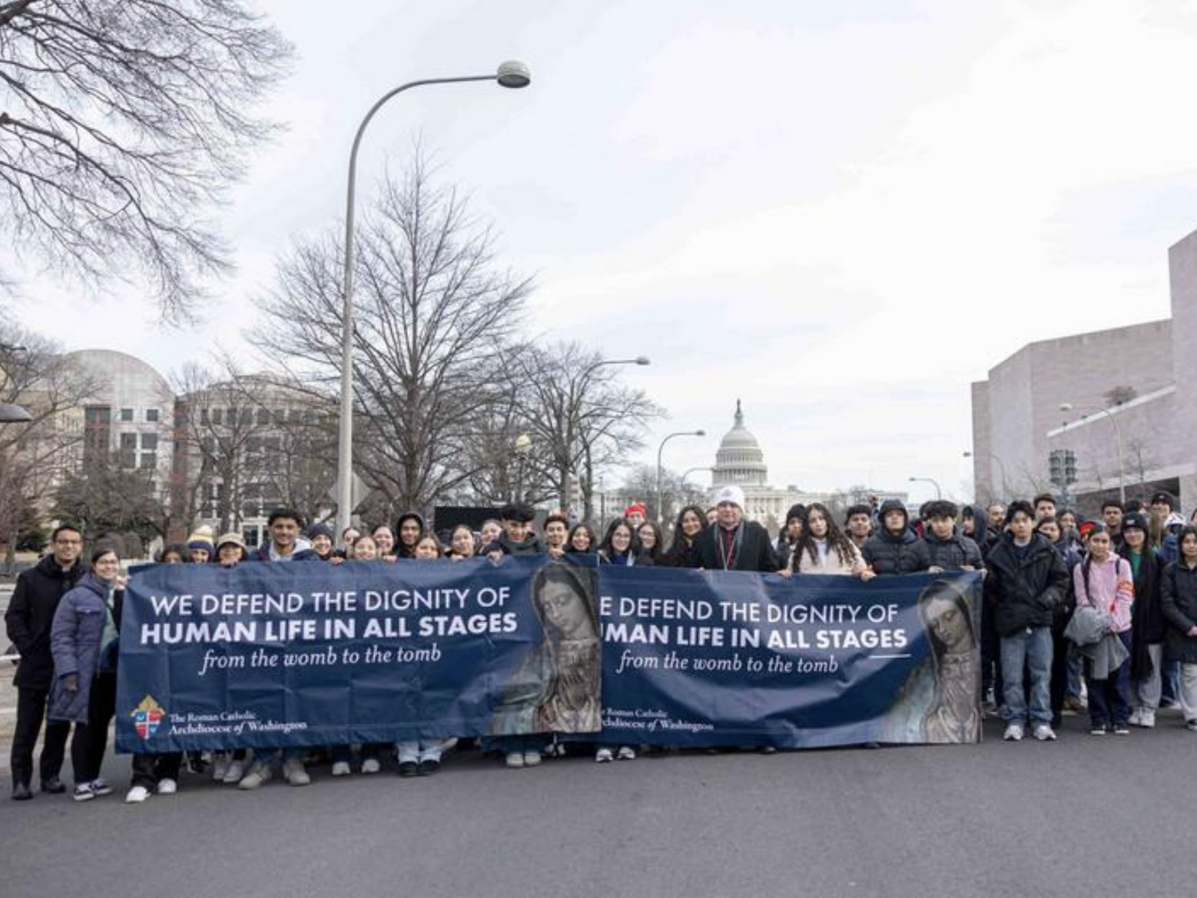 On Pennsylvania Avenue in Washington, D.C., Auxiliary Bishop Evelio Menjivar of Washington stands alongside young people from the Roman Catholic Archdiocese of Washington, D.C., who carried the archdiocese's banners during the March for Life on Jan. 23, 2026. (Catholic Standard photo by Mihoko Owada)