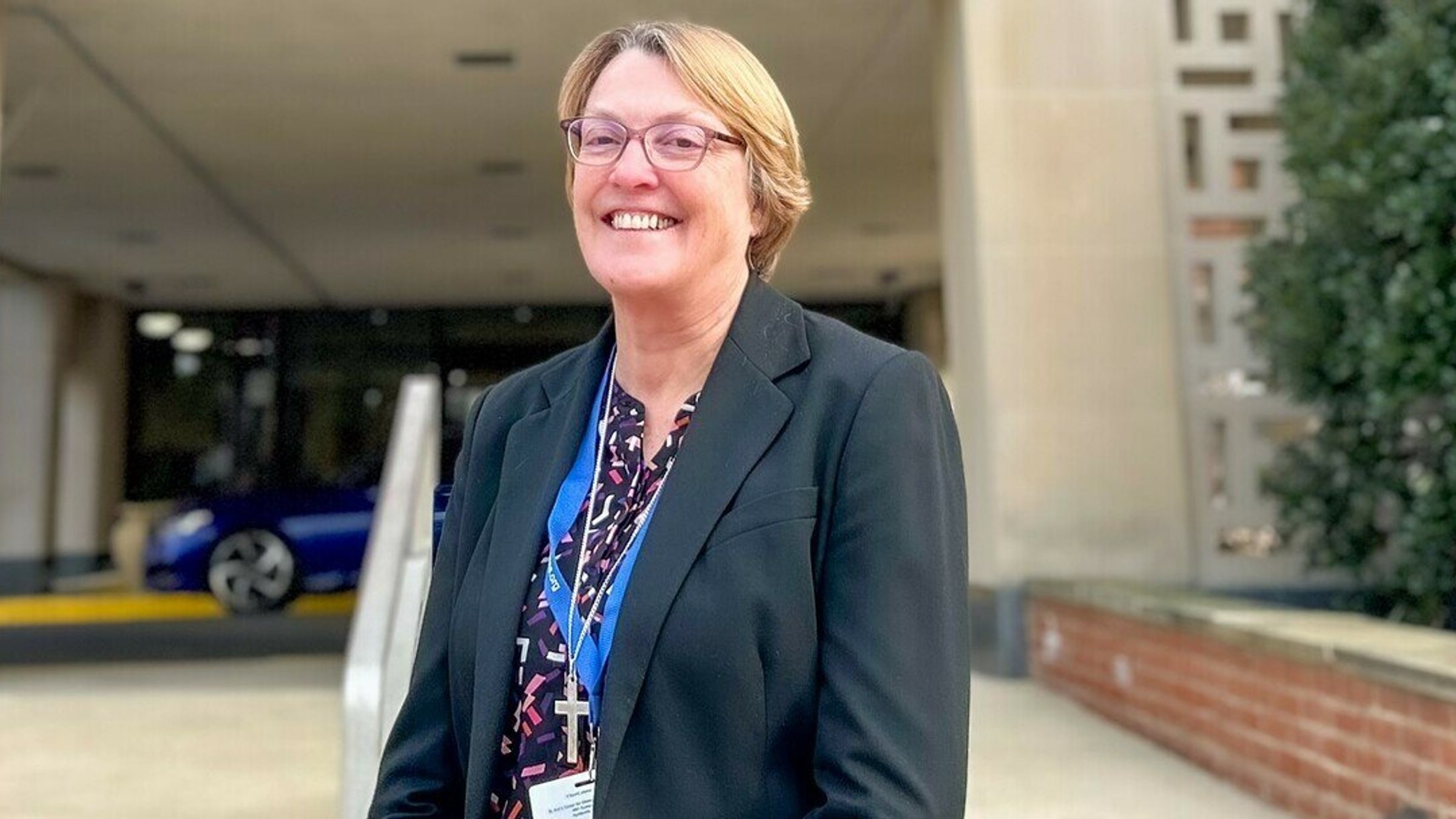 Around her neck, not far from her heart, Sister Nancy Downing wore two things that reflected special milestones in her life that unfolded in January. One was a necklace connected to a simple metal cross that she wears as a religious sister in the Congregation of Notre Dame. January 30 marked the 25th anniversary of her first vows as a Notre Dame sister. Hanging from a blue lanyard was a badge that she wears as the new CEO of St. Ann’s Center for Children, Youth and Families in Hyattsville, Maryland, which she began leading on Jan. 8.