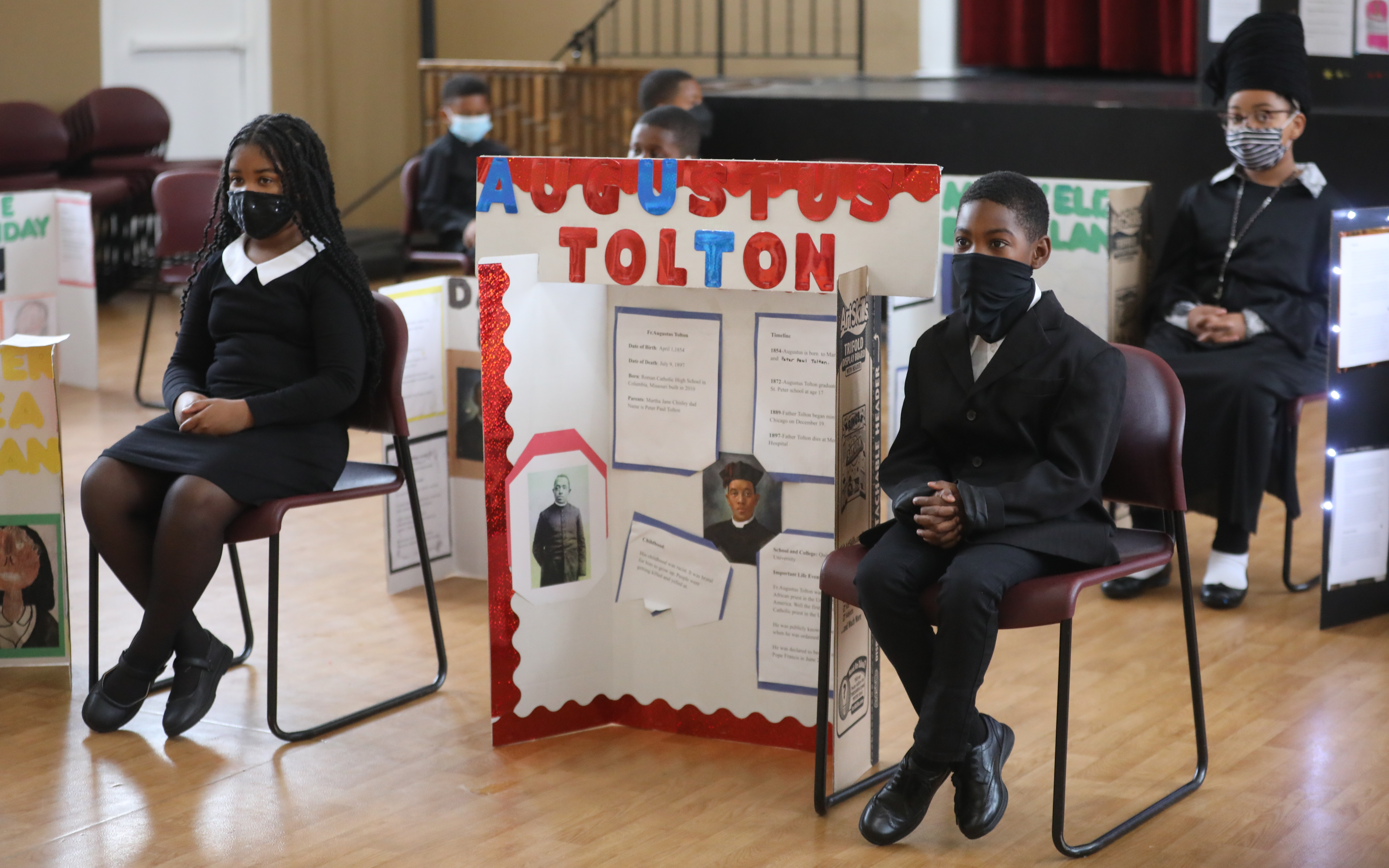 She had the idea of having her students select historic or contemporary Black Catholic men and women, research their lives and then portray them in the school’s multipurpose room. That morning, the room became an impromptu museum, with students dressed as those figures sitting beside tri-paneled poster boards that included reproduced paintings or photos or their hand-drawn portraits of the people they were portraying, plus facts about their lives, including a timeline and what their childhood was like.