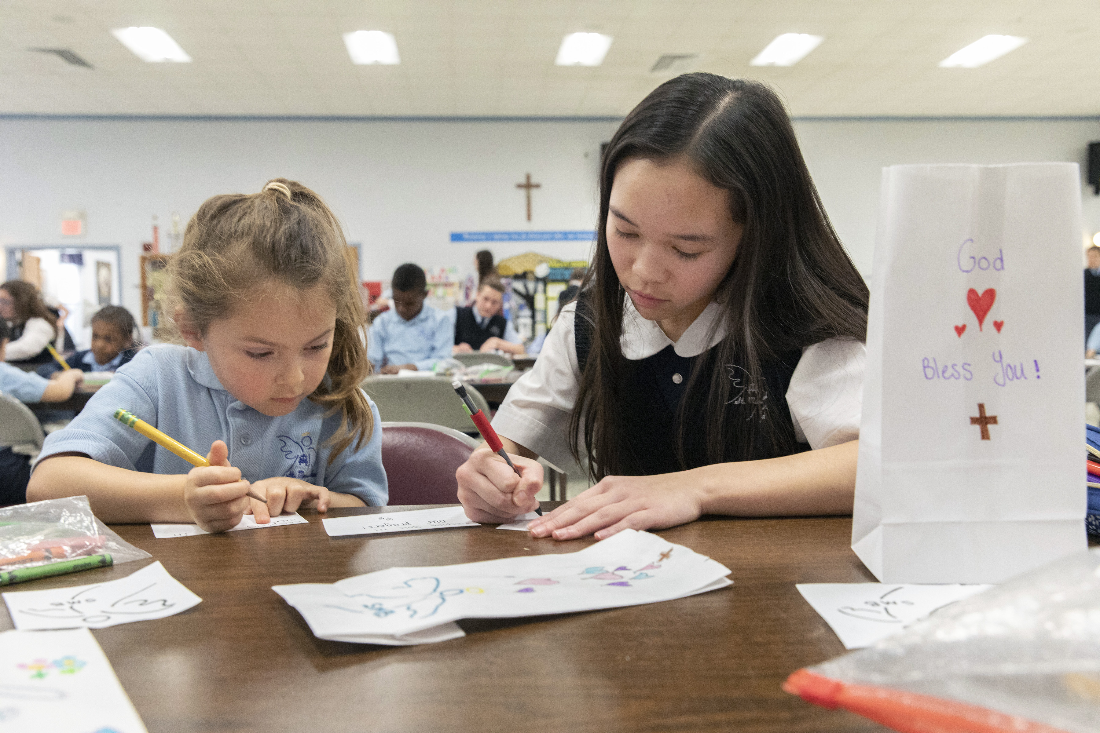 As the students were decorating and preparing the bags, they were paired off with their prayer partners, an older student and a younger student who participate in school activities, such as Mass, together.