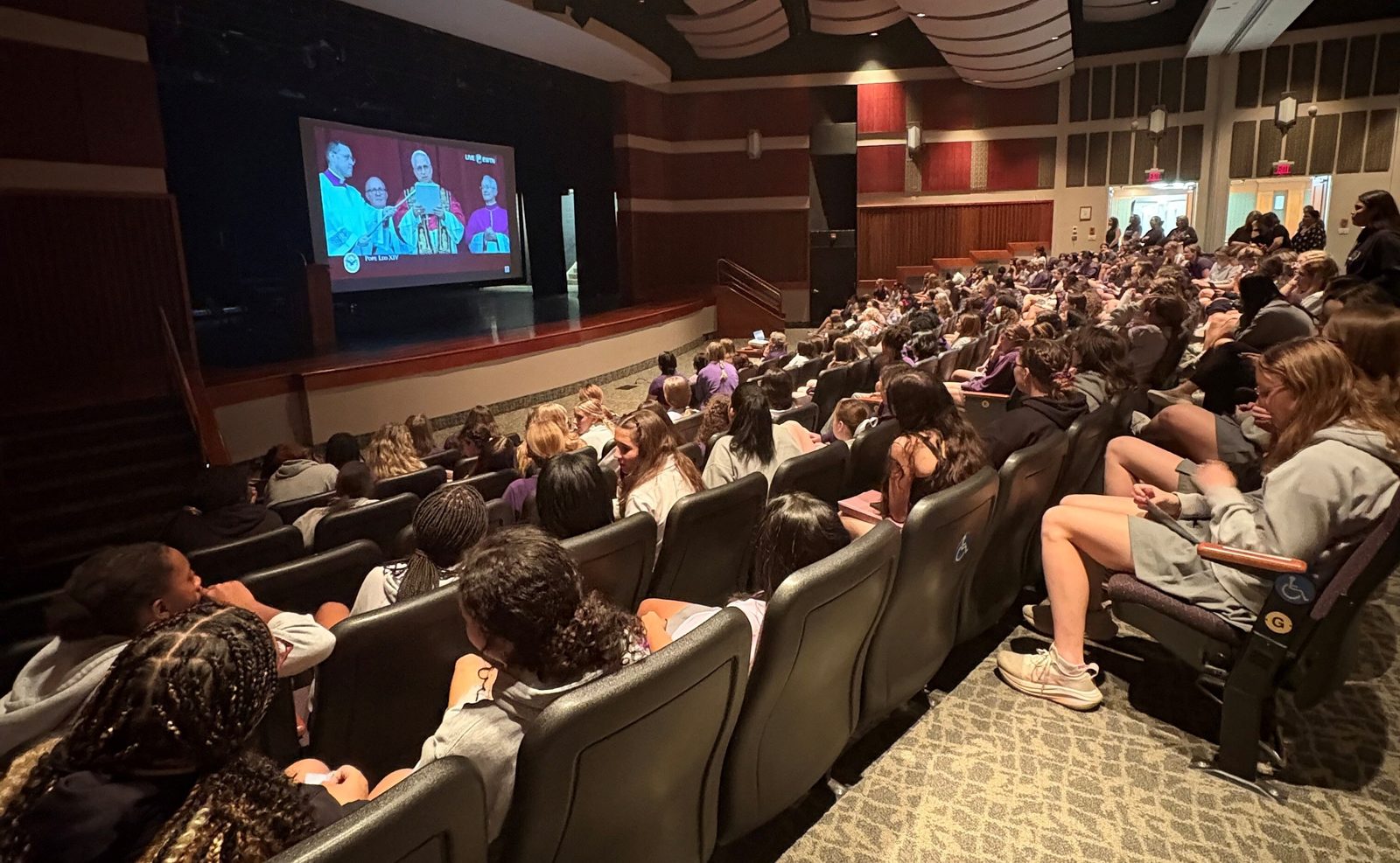 Holy Cross students not taking exams for Advanced Placement classes were called into the school’s theater, where they watched the drama unfold on a big screen. Hundreds of students assembled there about 12:30 p.m., just minutes after white smoke had billowed from the chimney of the Sistine Chapel signifying that the cardinals in the conclave had elected a new pope.