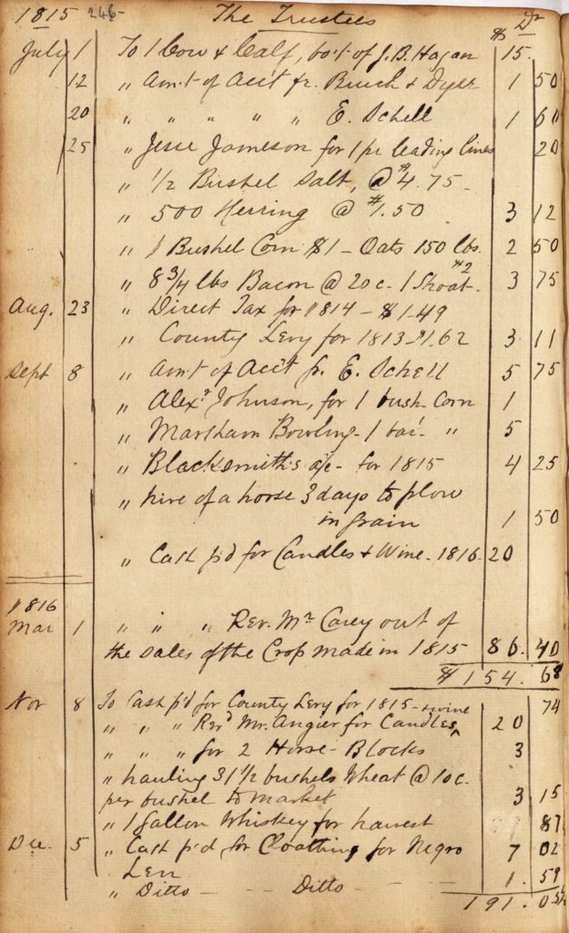 The parish accounts from 1815 to 1827 show that Tom was hired out each year to work on a different neighboring plantation. The plantation owner who hired him would pay the parish a sum of money for his hire. The sums ranged between $40 and over $100 per year. Len shows up in the parish accounts beginning in 1816 when the parish provided him with a new suit of clothes, which may indicate that he had recently been purchased. He was hired out each year like Tom was. The detailed parish account records end in 1829 with the tenure of Jesuit Father James V. Wiseman as pastor. Records relating to both Tom and Len end there as well.