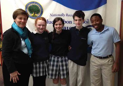 Marianne Moore, at left, the principal of St. John the Baptist School in Silver Spring for the past 22 years, poses with students Genevieve Maloney, Michaela McCarthy, Michael Quinn, and Shelby Meristel. She was recently among more than 200 local Catholics who received the Archdiocese of Washington’s Manifesting the Kingdom Award from Cardinal Wuerl, for outstanding service to the Church.
