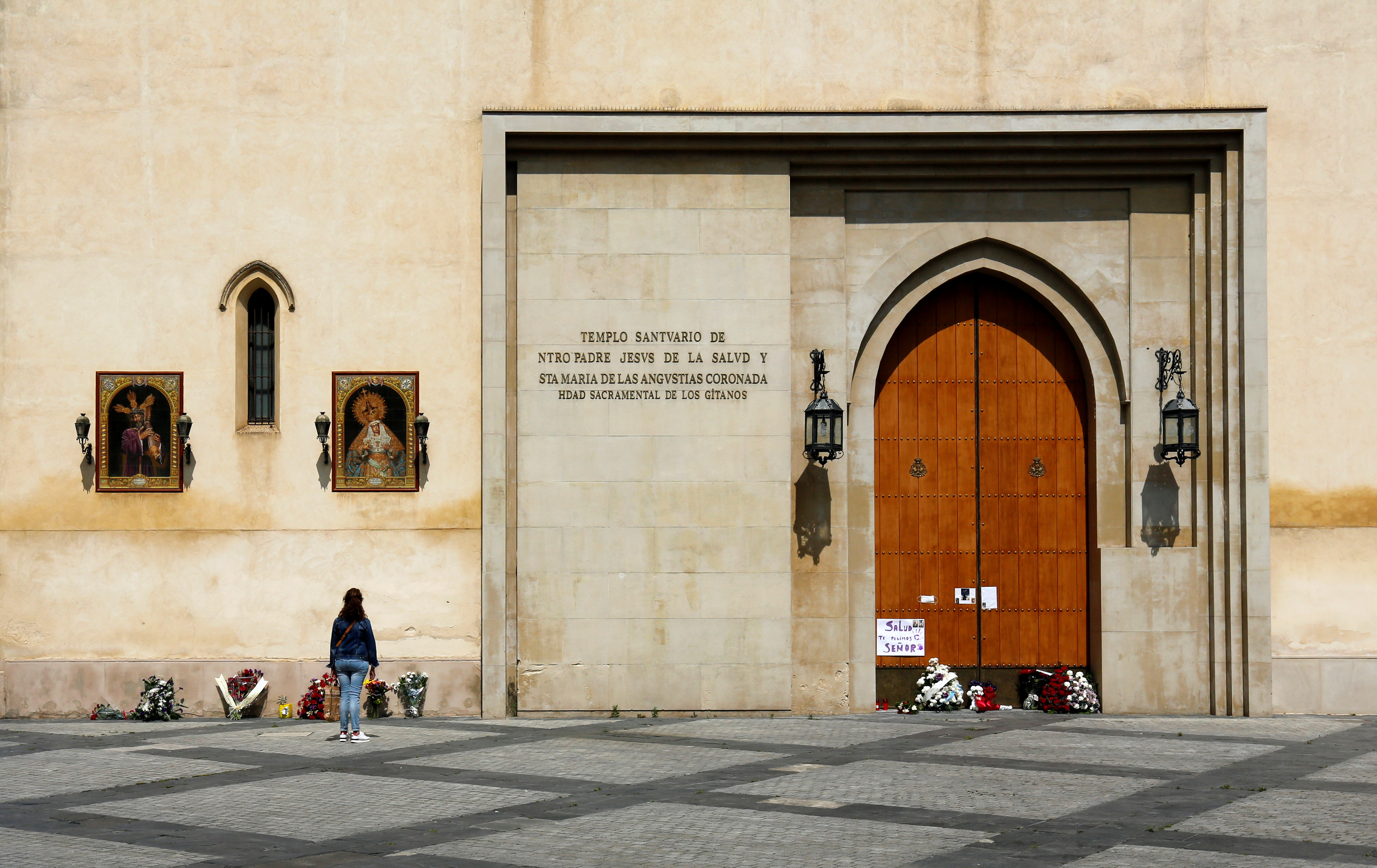 A woman prays outside a closed church in Seville, Spain, April 10, 2020, during the COVID-19 pandemic. (CNS photo/Marcelo del Pozo, Reuters)