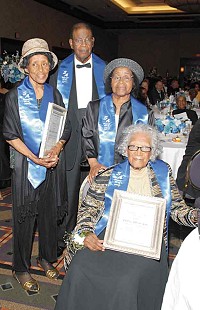 At its recent gala, St. Augustine Parish's 150th Anniversary Honorees included, seated in front, Pauline Jones; in middle row, sisters Harriet Braxton Parker and Florence Braxton; and standing behind them, George Dines. The St. Augustine 150th Anniversary Honorees also included Willis Thomas; and the late Leon Roberts, who gained national renown as the director of St. Augustine's Gospel Choir; Mother Mary Elizabeth Lange, the founder of the Oblate Sisters of Providence that staffed St. Augustine School for many years; and the St. Augustine Sunday School, which has educated generations of children at the parish.
