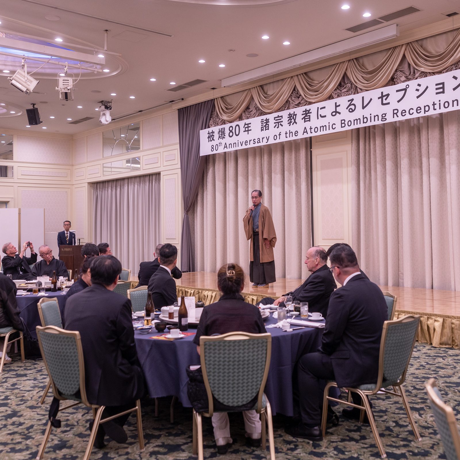 Archbishop Paul D. Etienne of Seattle (second from left) poses for photos with participants, including religious leaders, at a reception following the “Interreligious Symposium on Nuclear Issues and World Peace” on August 7, 2025, commemorating the 80th anniversary of the atomic bombings in Hiroshima and Nagasaki. (Catholic Standard photo by Mihoko Owada)