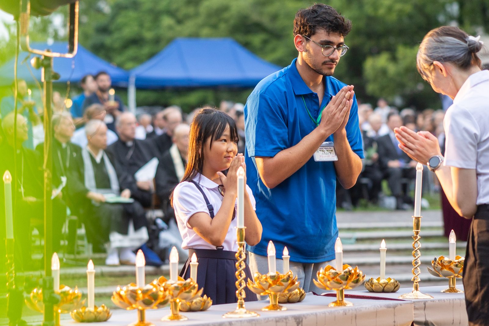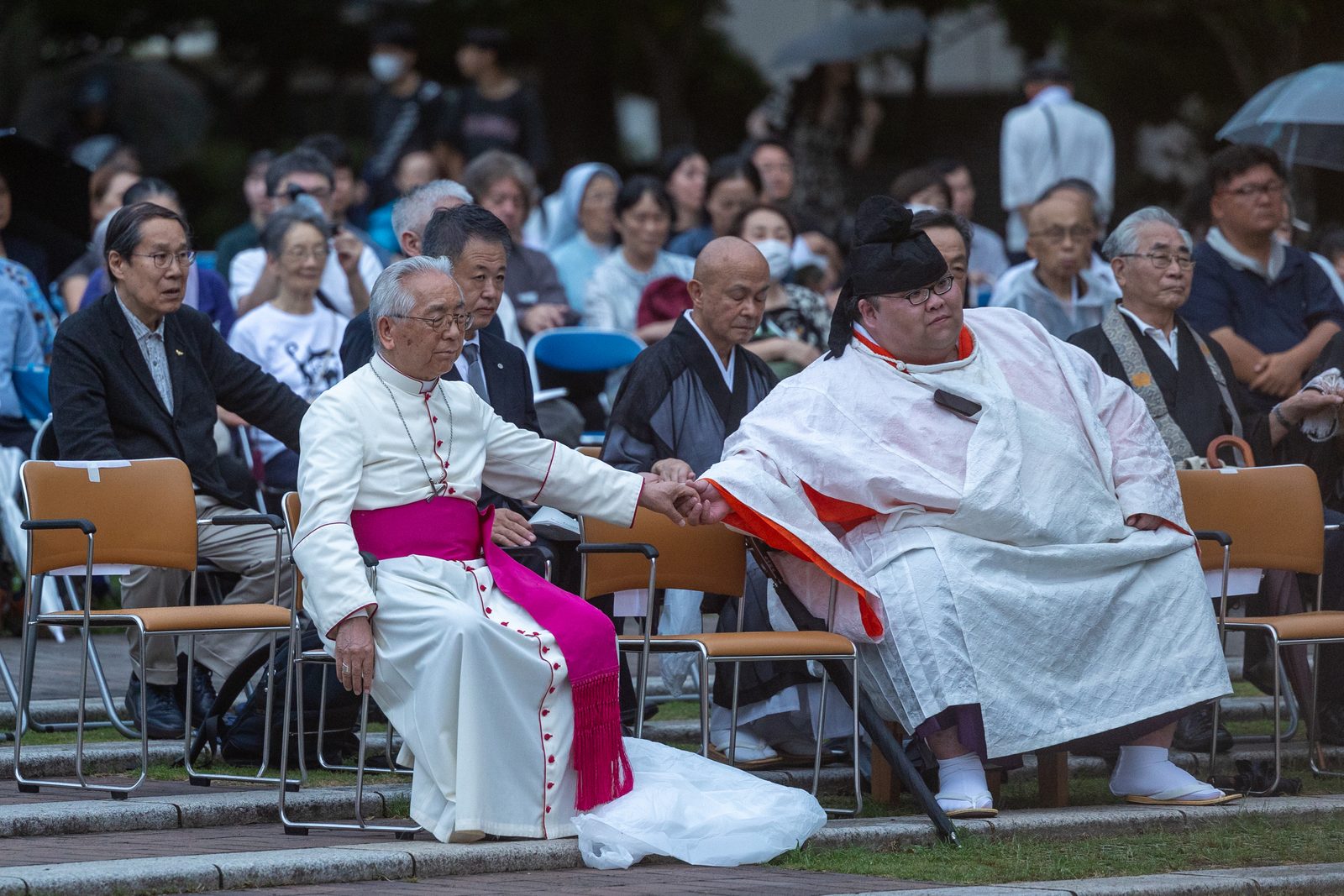 On the evening of Aug. 8, 2025, during the Memorial Service for the Victims of the Atomic Bombing, the attendees offering prayers included (from center to right) Archbishop John C. Wester of Santa Fe, New Mexico; Cardinal Robert W. McElroy of Washington; and Cardinal Blase J. Cupich of Chicago. The event was held at the Nagasaki Hypocenter Park. (Catholic Standard photo by Mihoko Owada)