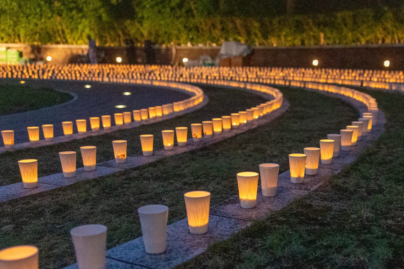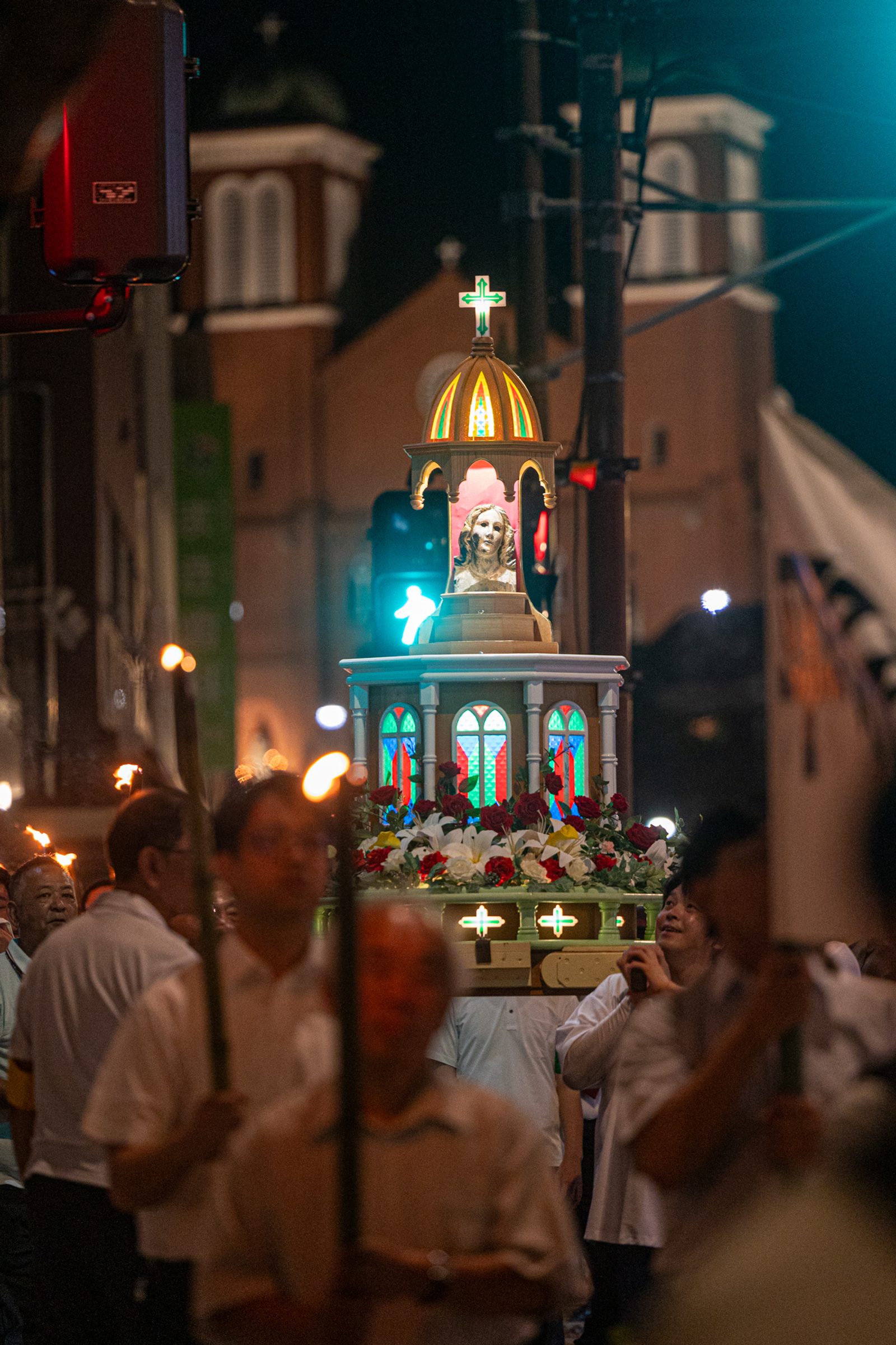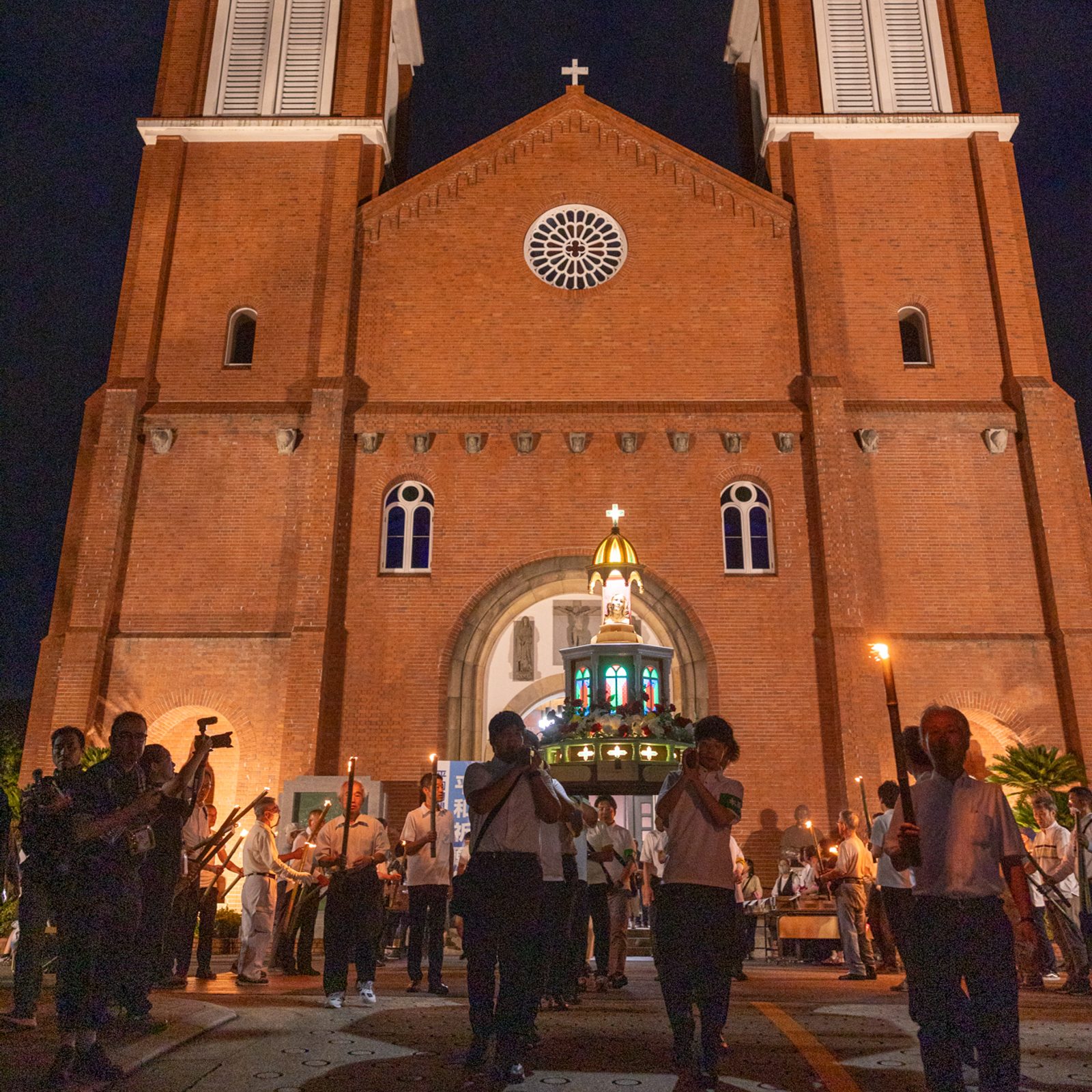 After a Peace Memorial Mass at Urakami Cathedral in Nagasaki, Japan, on Aug. 9, 2025, the 80th anniversary of the U.S. atomic bombing of that city, people participated in a torchlight procession to Nagasaki Peace Park. The head of a statue of Mary recovered in the rubble of the original cathedral after the bombing was carried in the procession. Joining the procession were U.S. college students participating in a Pilgrimage of Peace to commemorate the anniversaries of the atomic bombings of Hiroshima and Nagasaki. (Catholic Standard photos by Mihoko Owada)