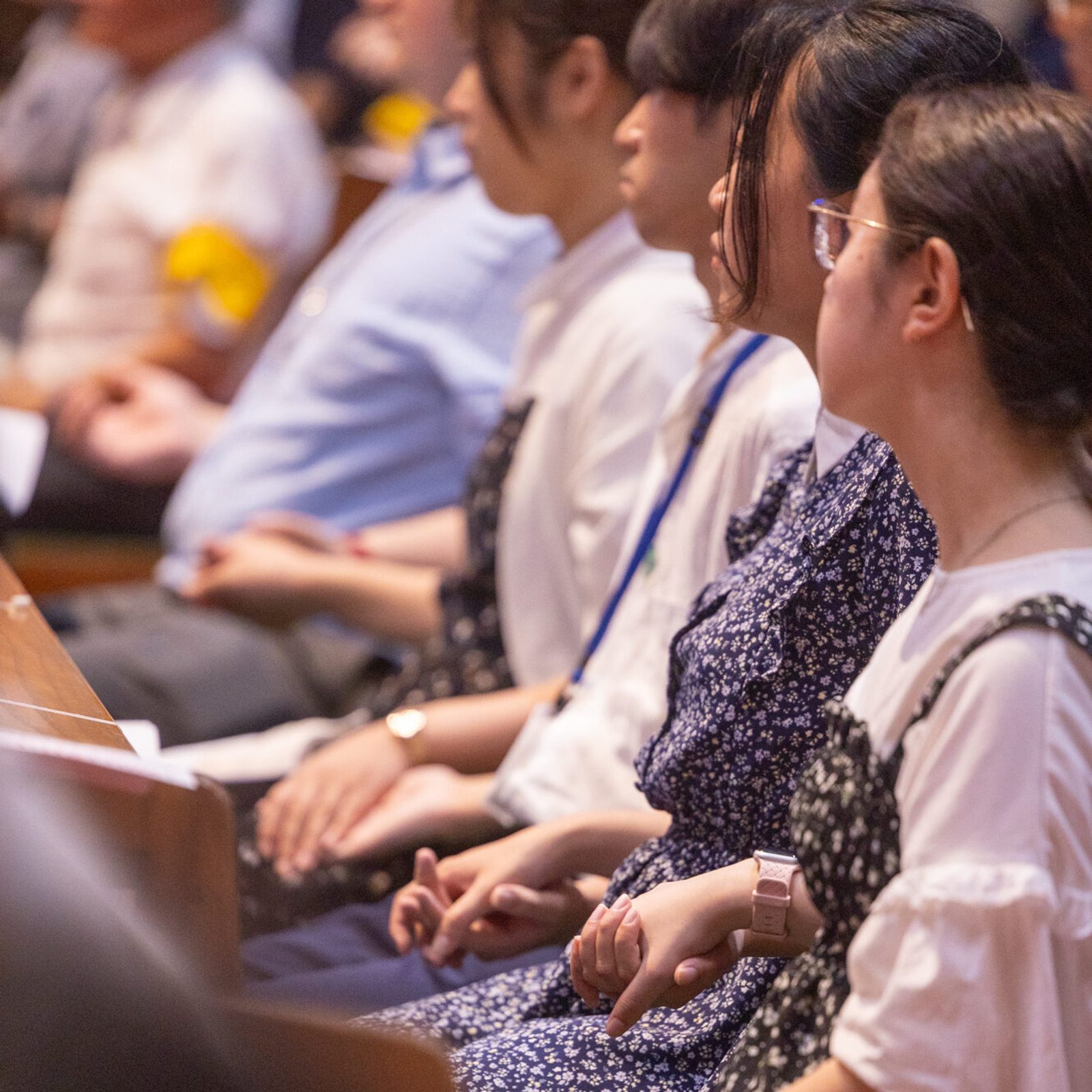 Students from U.S. universities hold prayer cards of Takashi and Midori Nagai they received after participating in the 11 a.m. Mass on Aug. 9, 2025 at Urakami Cathedral in Nagasaki that was held on the 80th anniversary of the U.S. atomic bombing of that city on Aug. 9, 1945. Dr. Takashi Nagai, a physician and radiologist who cared for survivors in the aftermath of the bombing, returned home to find the charred remains of his wife along with her melted rosary. Dr. Nagai, a convert to Catholicism, became a well-known advocate for peace and forgiveness until he died of leukemia in 1951. The couple is being considered for canonization. (Catholic Standard photo by Mihoko Owada)