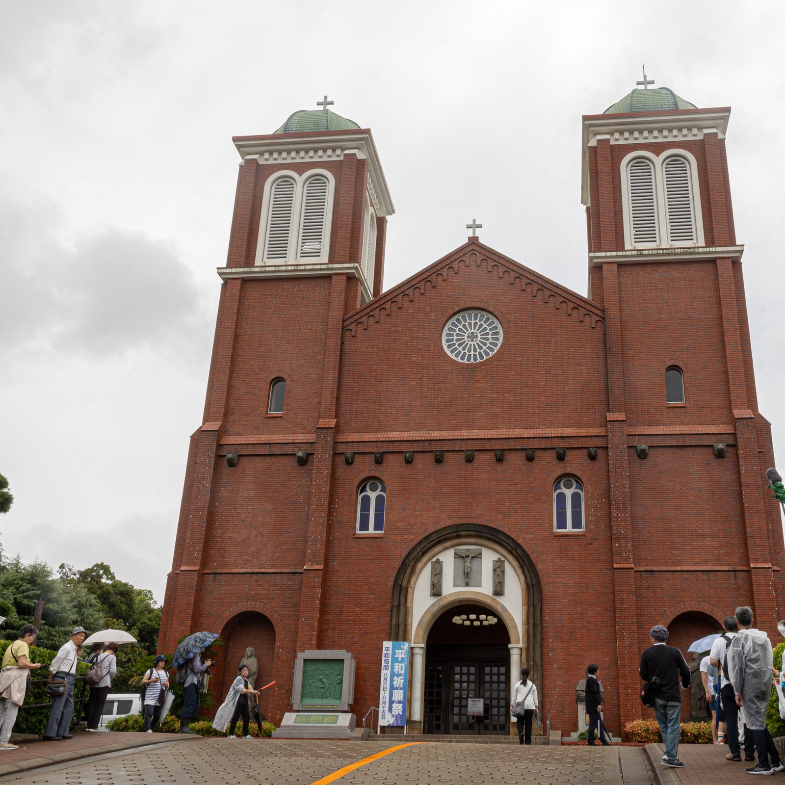 On the rainy morning of August 9, 2025, Urakami Cathedral is seen from Heiwa Koen Dori (Peace Park Street) in the Urakami neighborhood of Nagasaki, Japan. (Catholic Standard photo by Mihoko Owada)