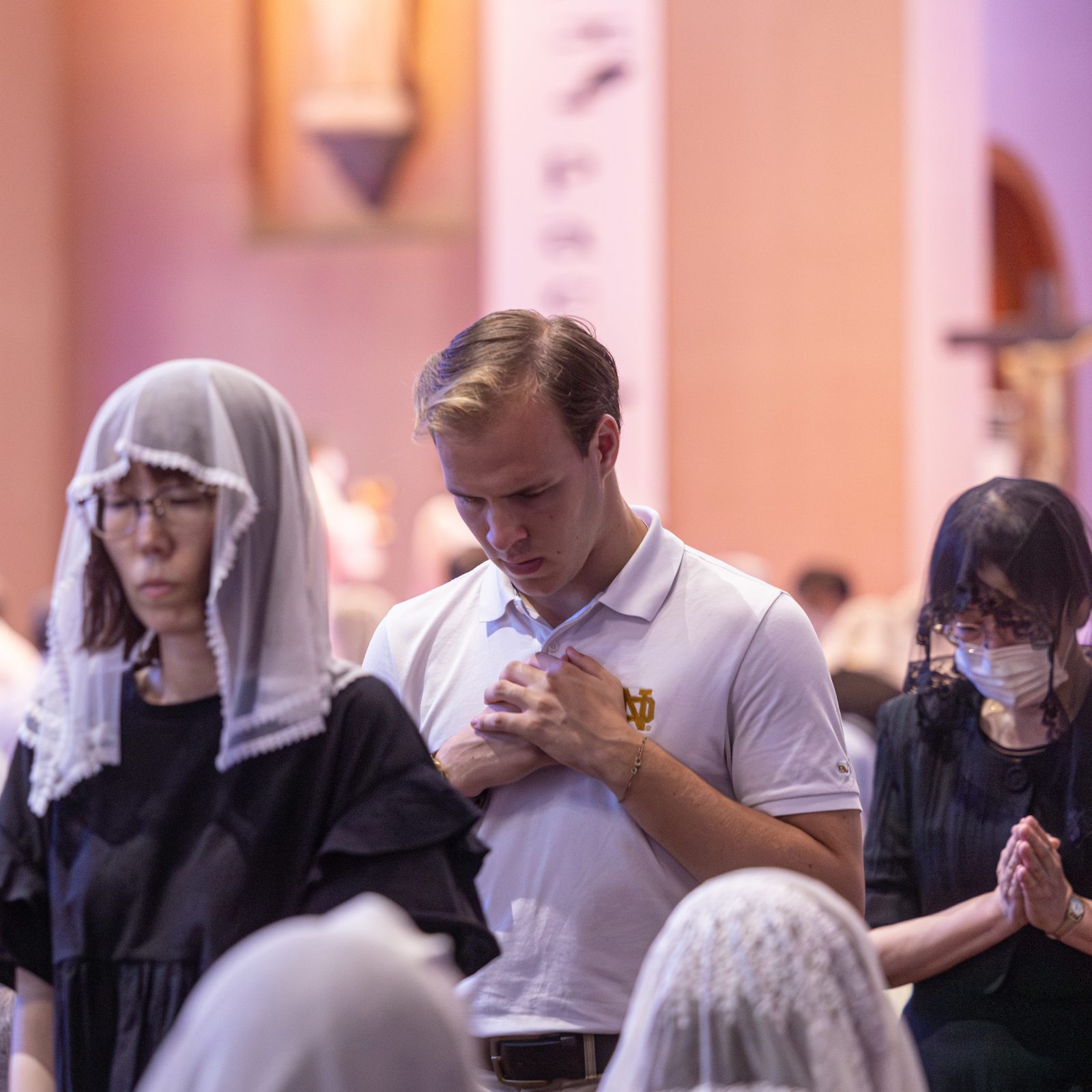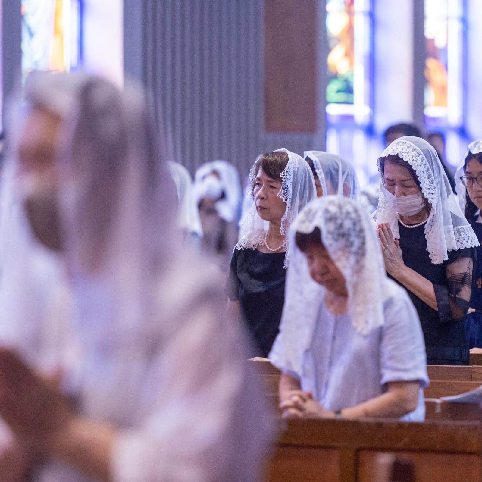 A woman prays during the 11 a.m. Mass at Urakami Cathedral in Nagasaki, Japan on Aug. 9, 2025 when the two bells rang out together at 11:02 a.m. for the first time in 80 years. One of these bells was recast for the cathedral by American Catholics. The bells rang out on the 80th anniversary of the moment when the atomic bomb dropped by the United States exploded over Nagasaki on Aug. 9, 1945. (Catholic Standard photo by Mihoko Owada)