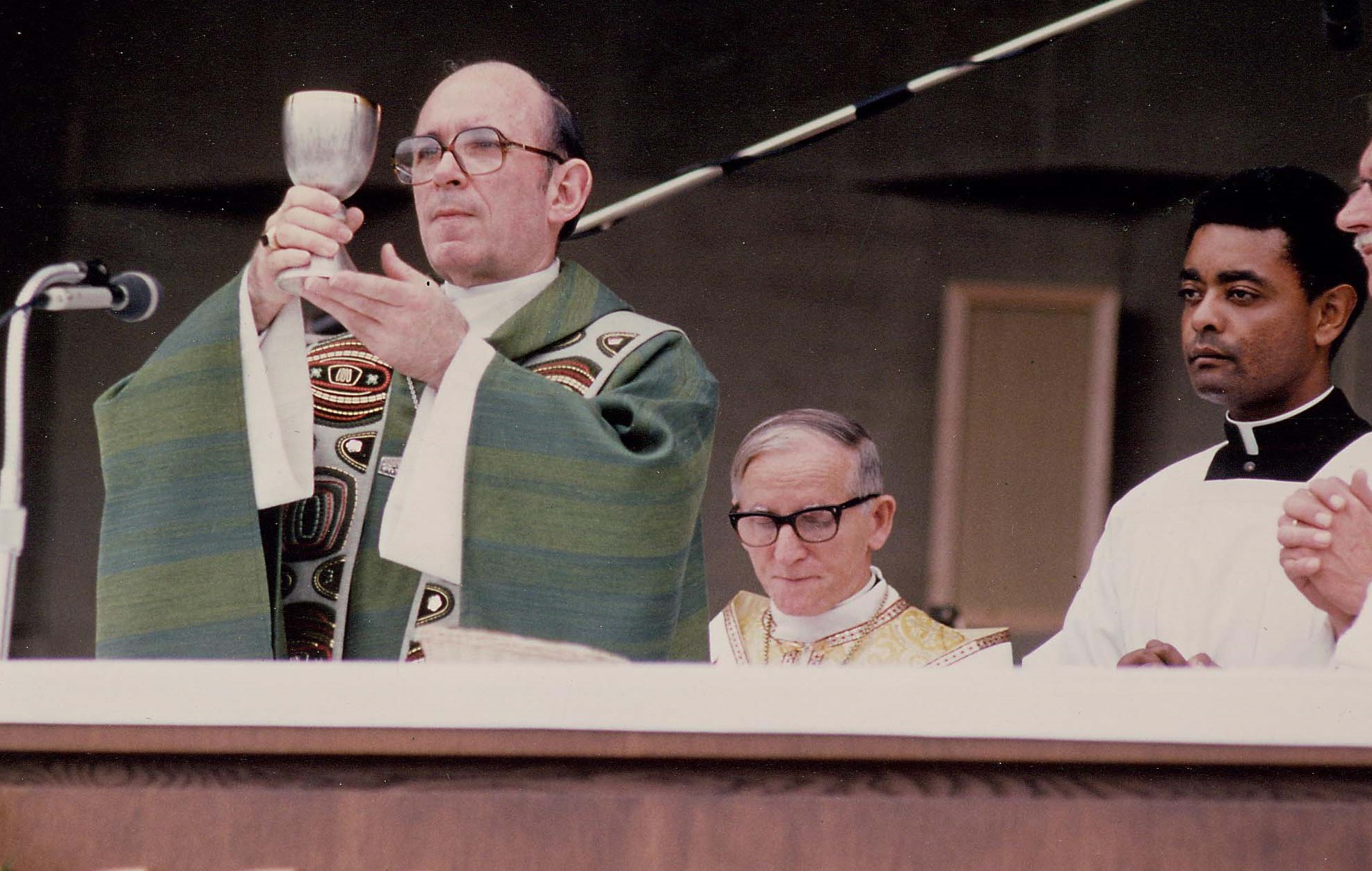 Cardinal Joseph Bernardin gives then-Chicago Auxiliary Bishop Wilton Gregory the bishop’s ring during his episcopal ordination on Dec. 13, 1983 at Holy Name Cathedral. (Photo by James Kilcoyne/Chicago Catholic)