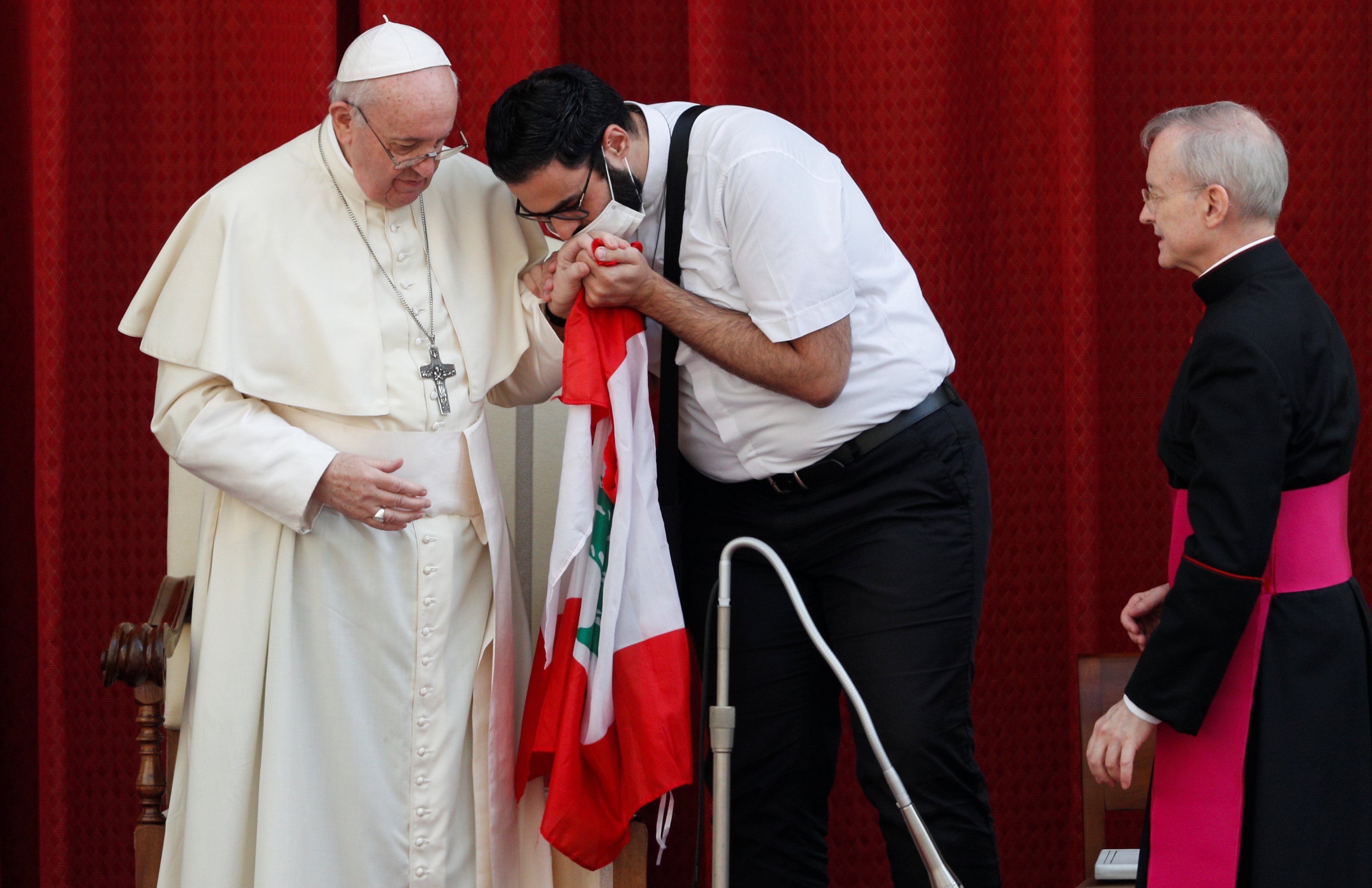 As Pope Francis greeted people gathered in the courtyard of the Apostolic Palace for his general audience Sept. 2, Father Georges Briedi, a member of the Congregation of Lebanese Maronite Missionaries, held up a Lebanese flag.