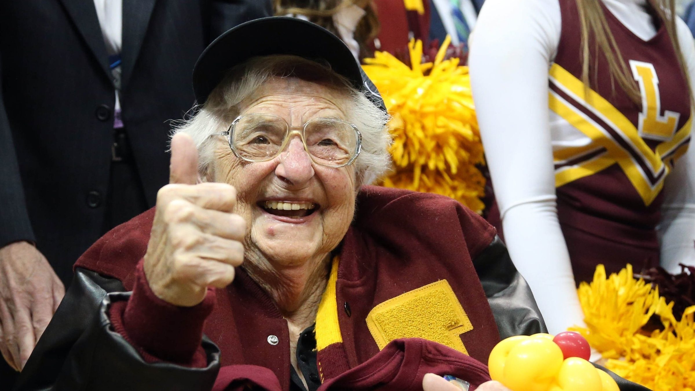 Her spiritual encouragement often blended faith with practical wisdom. During her 106th birthday in August, she urged Loyola students to “make new friends, talk to your old friends,” and to “become the people that God has decided you will be.” Her signature message – “Worship, Work, Win” – became both her personal motto and the slogan that adorns a banner inside Loyola’s Gentile Arena.