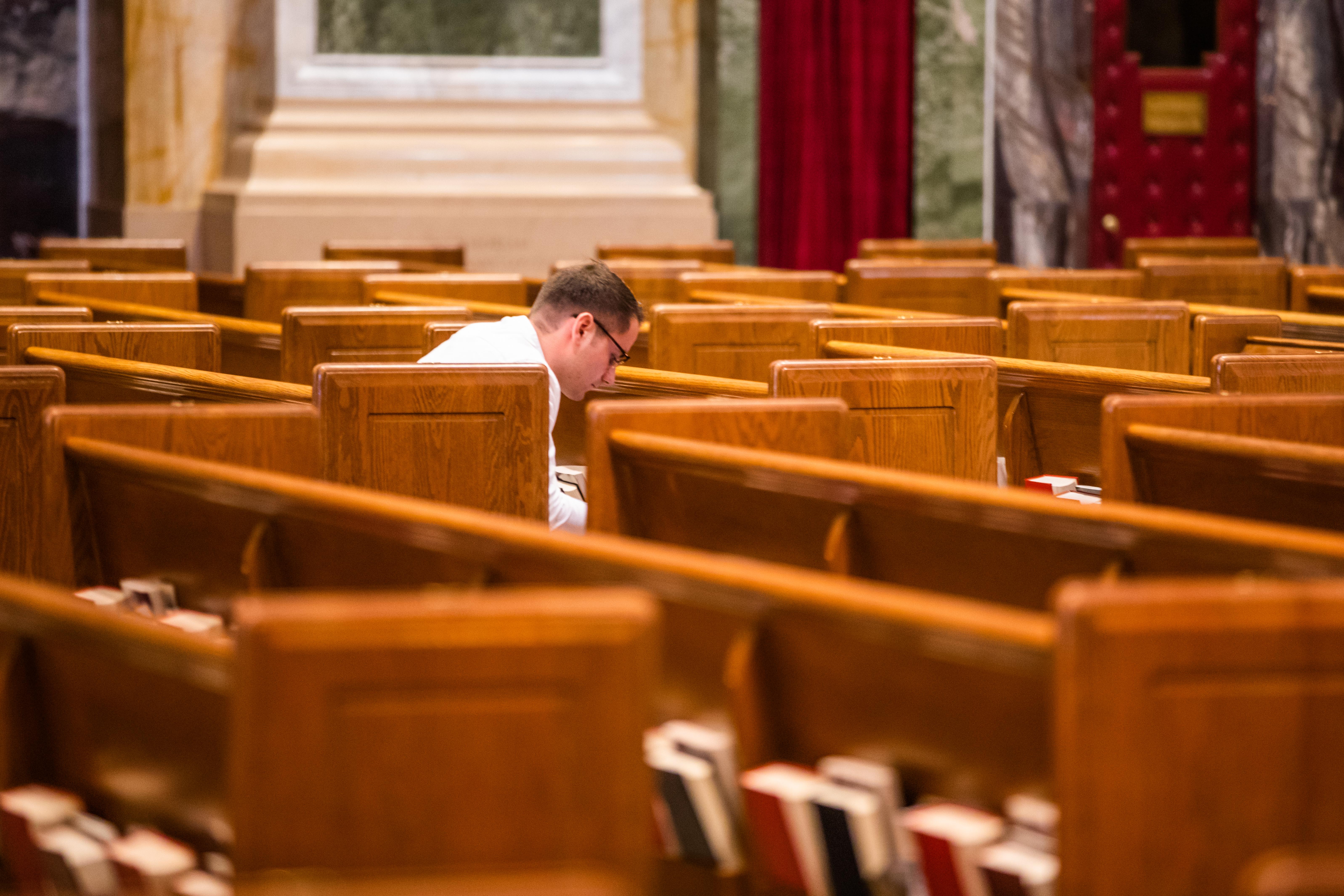 A man prays after a noontime Mass at the Cathedral of St. Matthew the Apostle on March 13, one day before public Masses in the Archdiocese of Washington were canceled until further notice as a precaution against the spread of the coronavirus. (CS photo/Andrew Biraj)